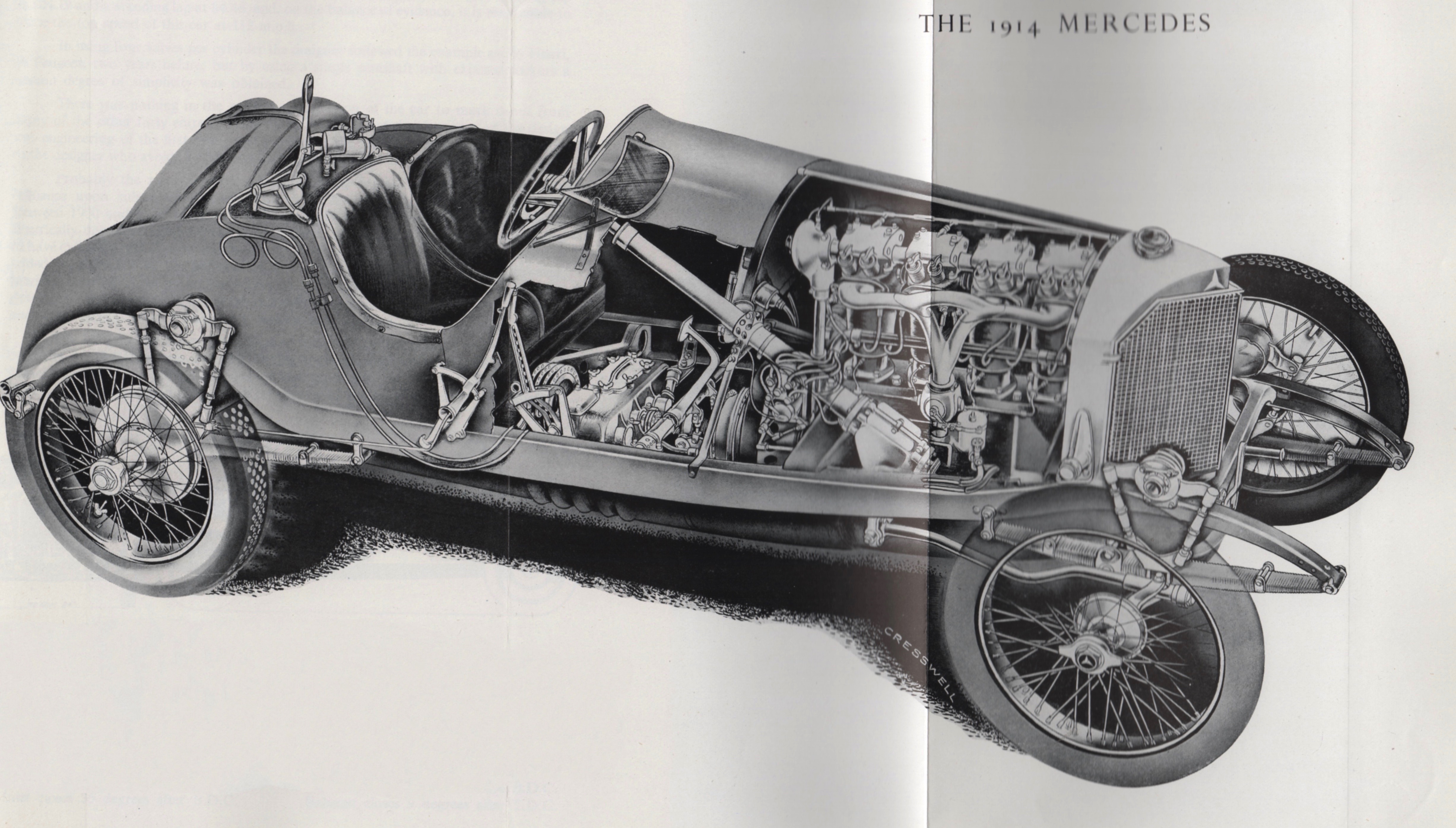 Illustration by L.C. Cresswell from The Grand Prix Car. Note the 1914 car’s knock-off wheels and eschewing of chain drive.