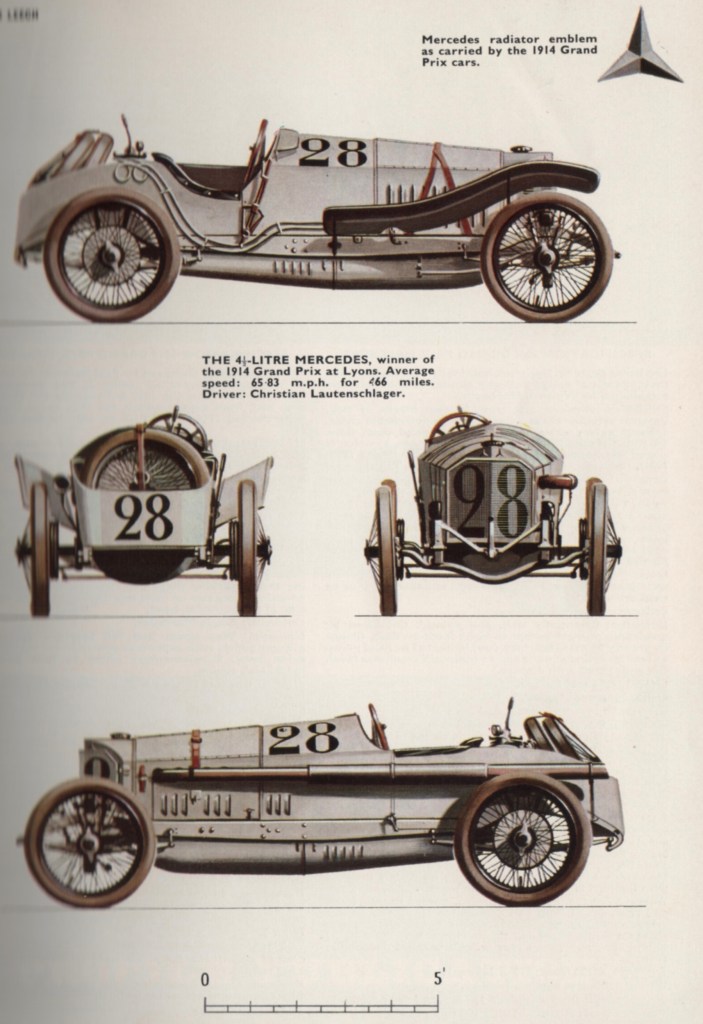 YESTERDAY, ANTHONY BIRD OFFERED ANALYSIS of the 1908 G.P. Mercedes, a 12.8-liter behemoth winning the Grand Prix at Dieppe much to the consternation of the French (who, in a sense, pouted for two years without international Grands Prix). Today, both Bird and Laurence Pomeroy examine the 1914 G.P. Mercedes, a car that was conservative in some ways (no front brakes, for example), yet advanced in others and exploiting the 4 1/2-liter limit in force for the Grand Prix at Lyon. Here are tidbits gleaned from Bird’s article in Classic Car Profiles 1-24 as well as Pomeroy’s having the 1914 G.P. Mercedes as one of the 17 cars analyzed in The Grand Prix Car Volume One.