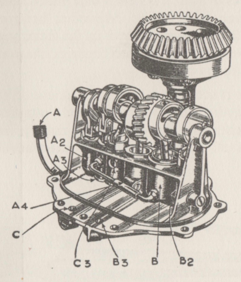 Adieu, Drip-and-Splash. Bird said, “the drawing also shows the plunger-pump system of pressure lubrication (the 1908 engines had still relied upon drip-feed-and splash basically.”