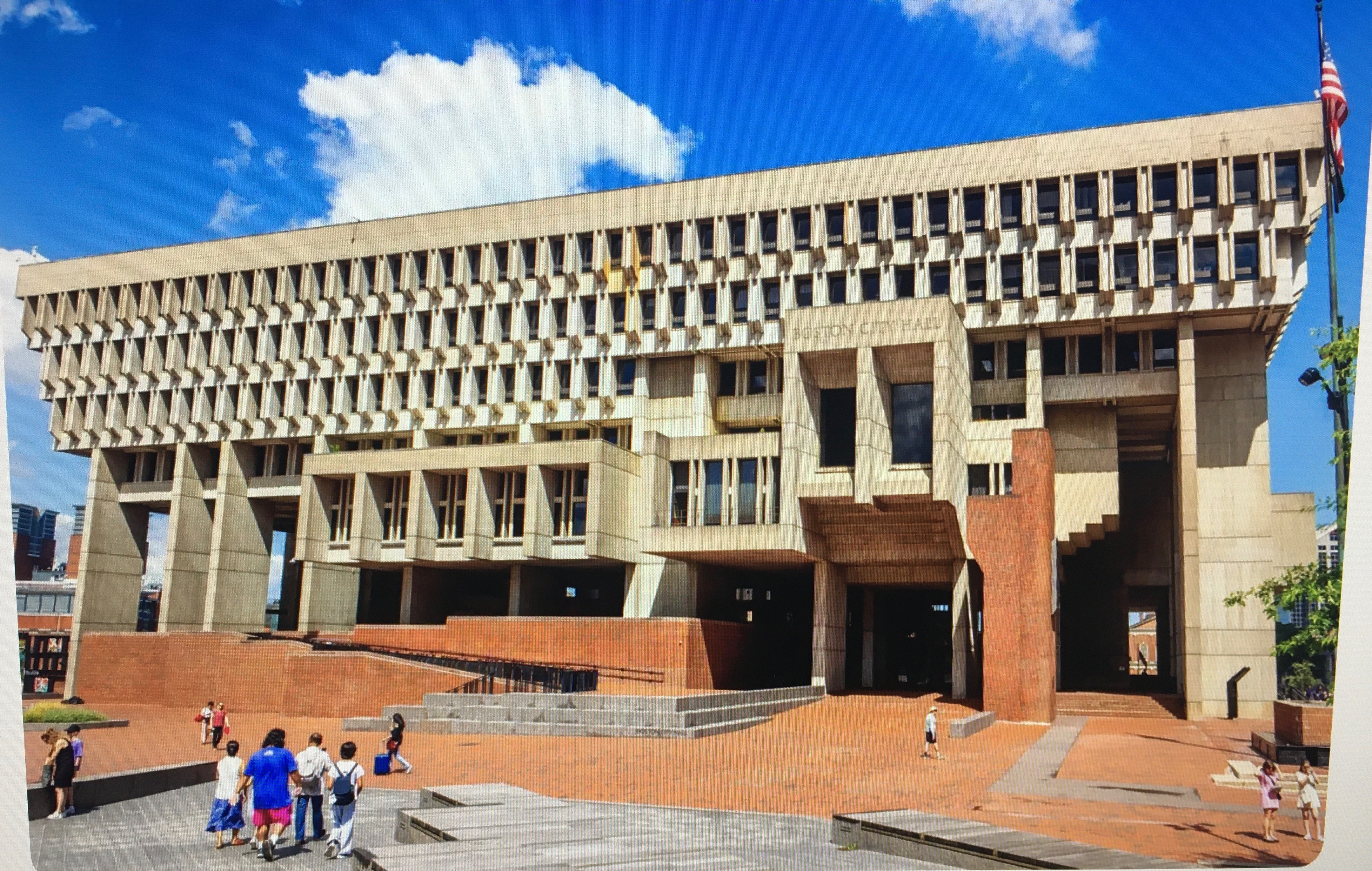 Wikipedia writes, “A common theme in brutalist designs is the exposure of the building’s inner-workings—ranging from their structure and services to their human use—in the exterior of the building. In the Boston City Hall, designed in 1962, the strikingly different and projected portions of the building indicate the special nature of the rooms behind those walls, such as the mayor’s office or the city council chambers.”