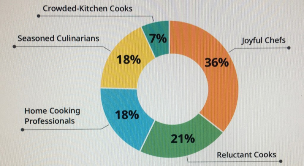 Seasoned Culinarians are those who cook the most, an average of 9.6 meals per week. Almost all (99 percent) enjoy cooking. They constitute the third largest categories in North America (11 percent) and Northern, Southern, and Western Europe (18 percent).”