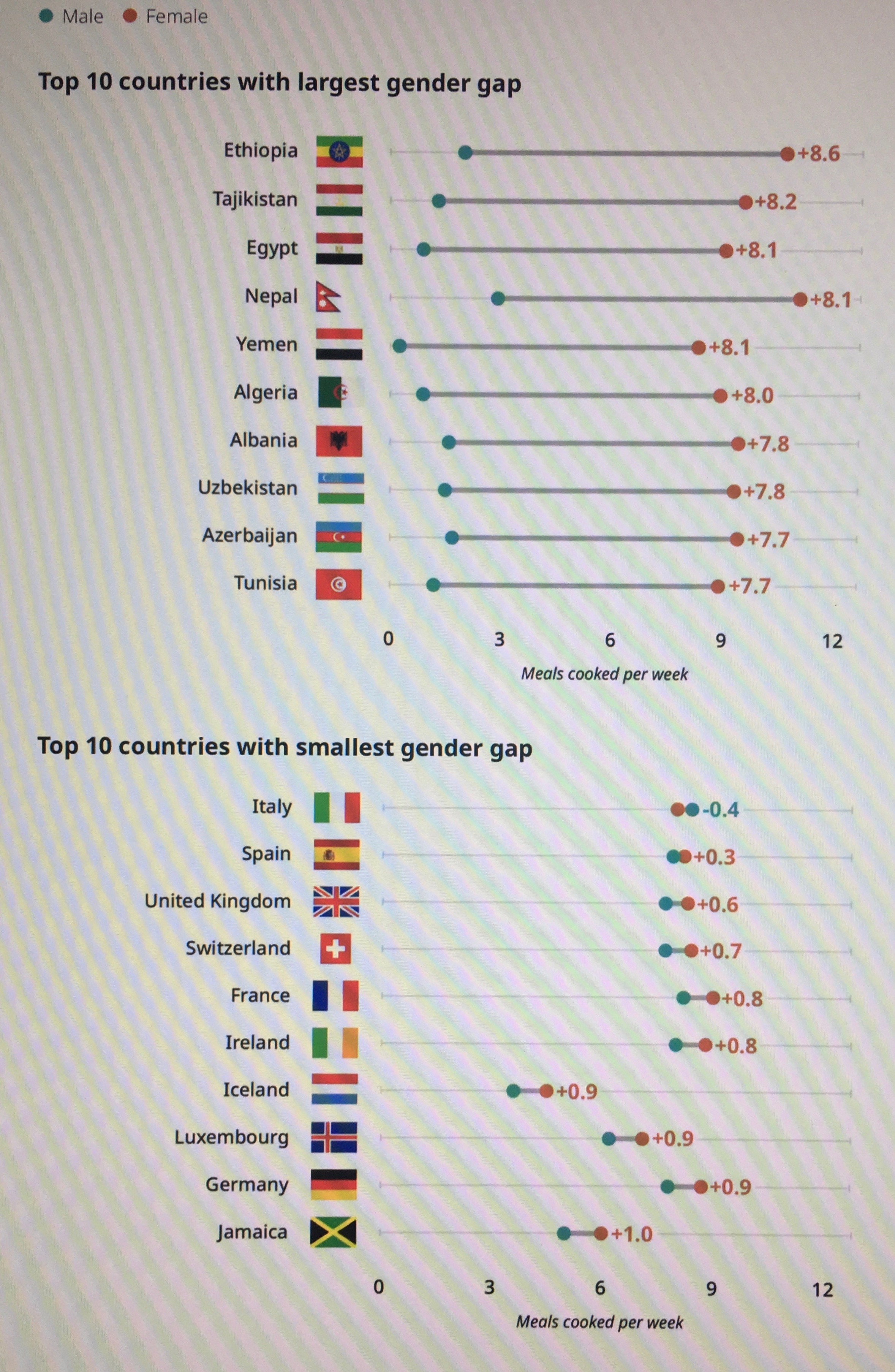 Tables Turned. Gallup Cookpad observes, “In 2021, Jamaica was the only country where men cooked at higher levels than women—though the most recent survey finds that the tables have turned, with women cooking on average 1.0 more meals per week than men.”