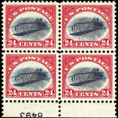 To true philatelists, it wasn’t the Jenny that’s inverted, it’s the red frame, as shown by this block of four.