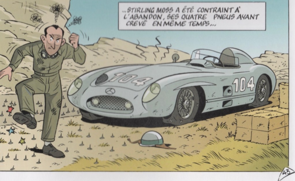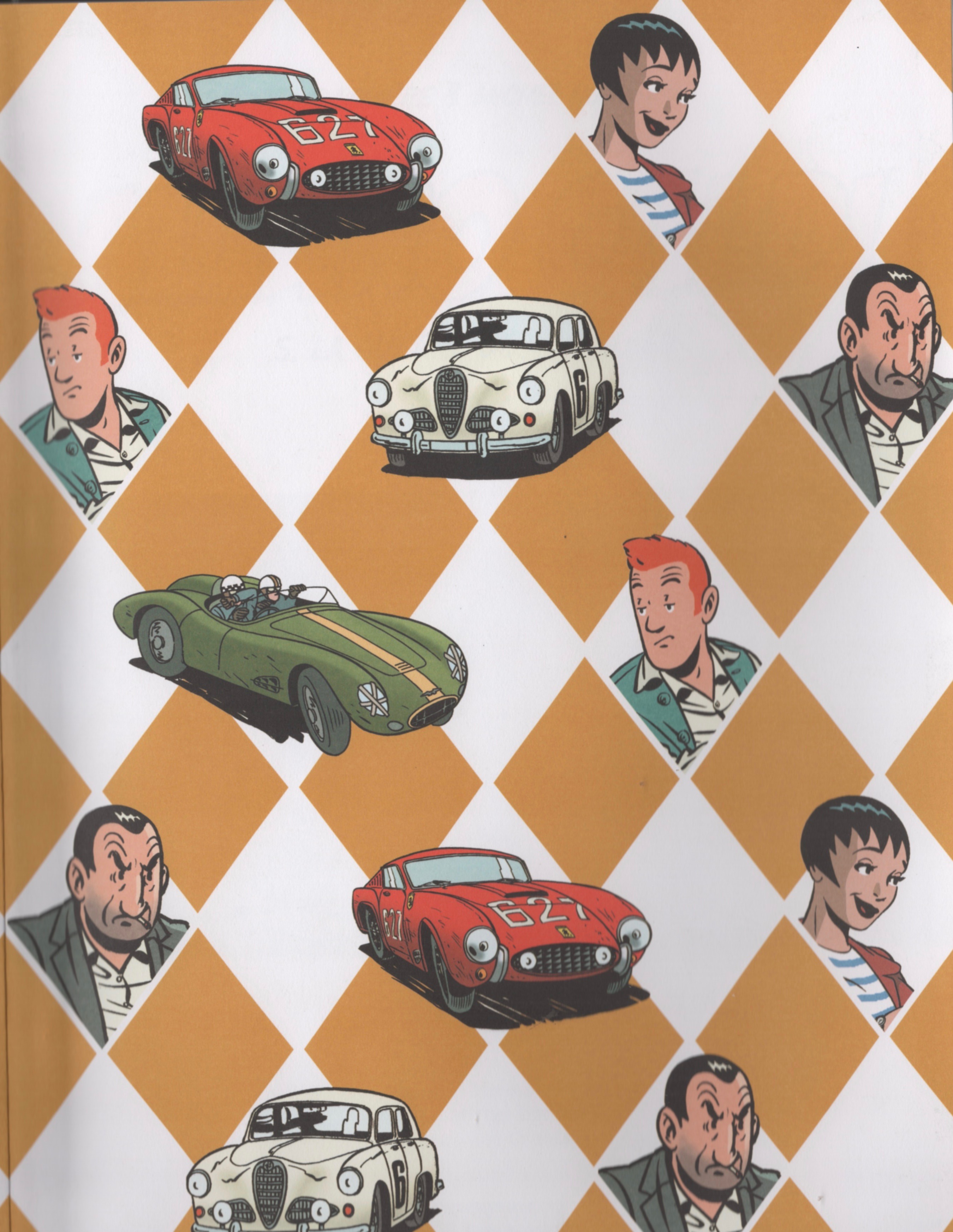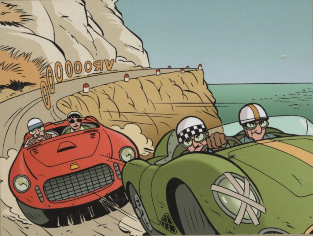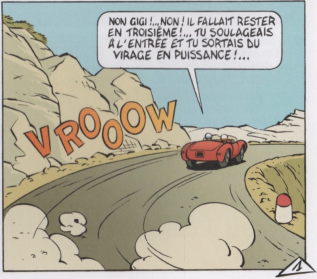 Michel displays a deft hand in drawing cars and settings of the era. And Denis captures sound effects appropriately: VROOOO, VROOW, and rendering the typical racing Ferrari’s off-the-line VROP VROP VROP.