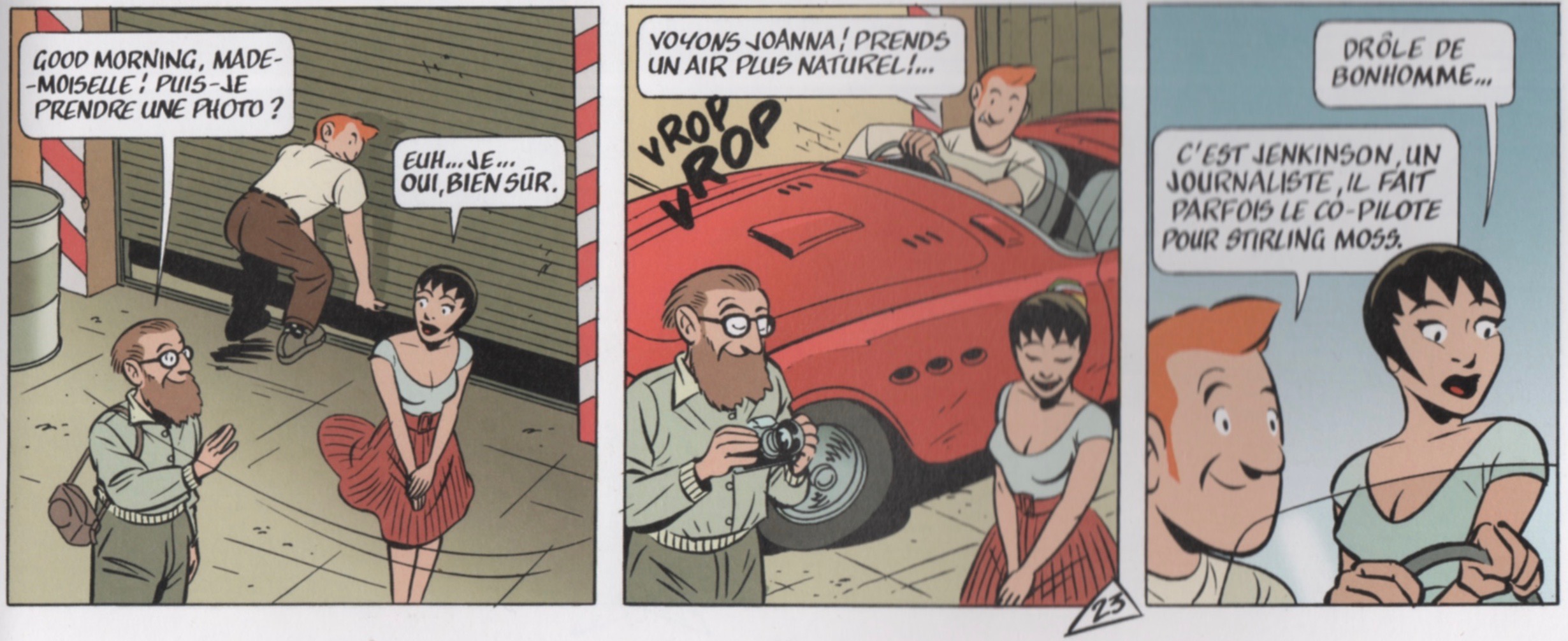 There are VROPS VROPS and PANS PANS a’plenty in preparation for the Targa Florio, in which our hero Mauro competes with the likes of Stirling Moss (Mercedes-Benz), Eugenio Castellotti (Ferrari), and Luigi Musso (Maserati). Early on, a little bearded guy asks Joanna “Puis-je prendre une photo?”