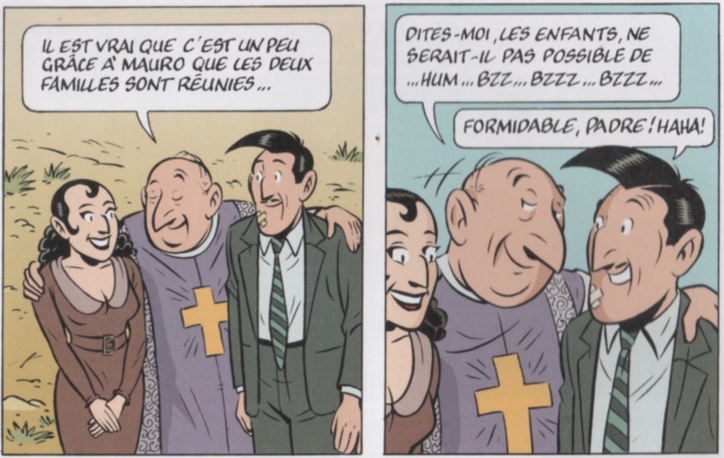 The backstory of this feud involves “la plus jolie femme du village: la somptuese Giulietta Larini.” That is, her legs go all the way up too. The two family scions compete with a third guy, “Giacomelli, timide, romantique et enflammé.” Without giving away too much, Giulietta is lost in a stormy sea, Giacomelli answers a call to the priesthood, and the scions sire Roberto and Graziella, Spottorno and Scratellini respectively.