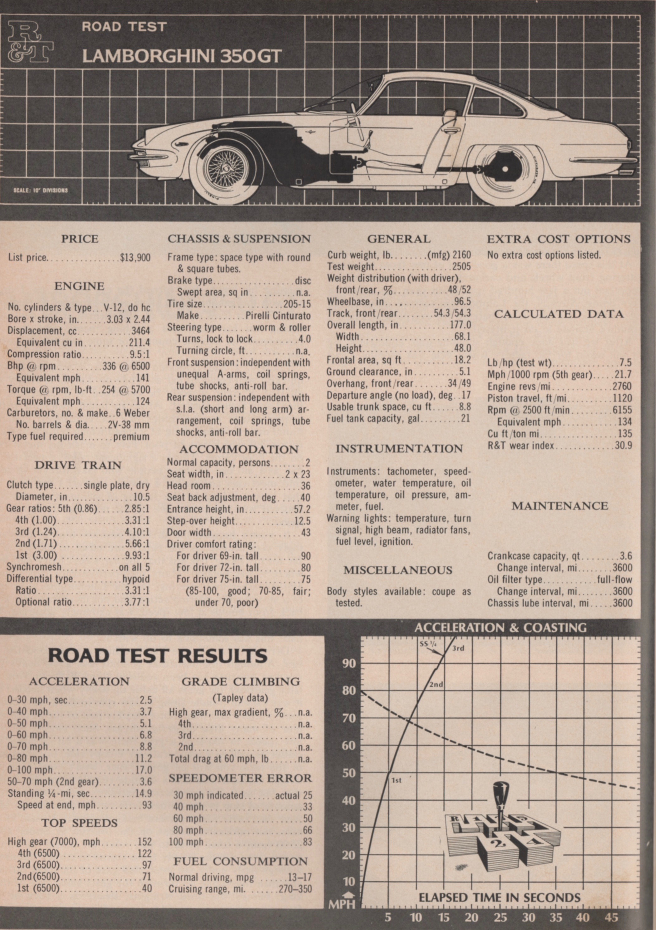 One of the First 350 GTs. “This test,” Henry wrote, “had been floating around since last year some time, but one thing and another (like a 3-day dense fog, for instance) prevented its completion…. At any rate, we were supposed to have one of the latest coupes for Geneva but an imminent customs strike demanded its departure before schedule, so we had to manage with an old one which was a dealer’s demonstrator in for one of its periodic services. It was, in fact, one of the first cars delivered….”