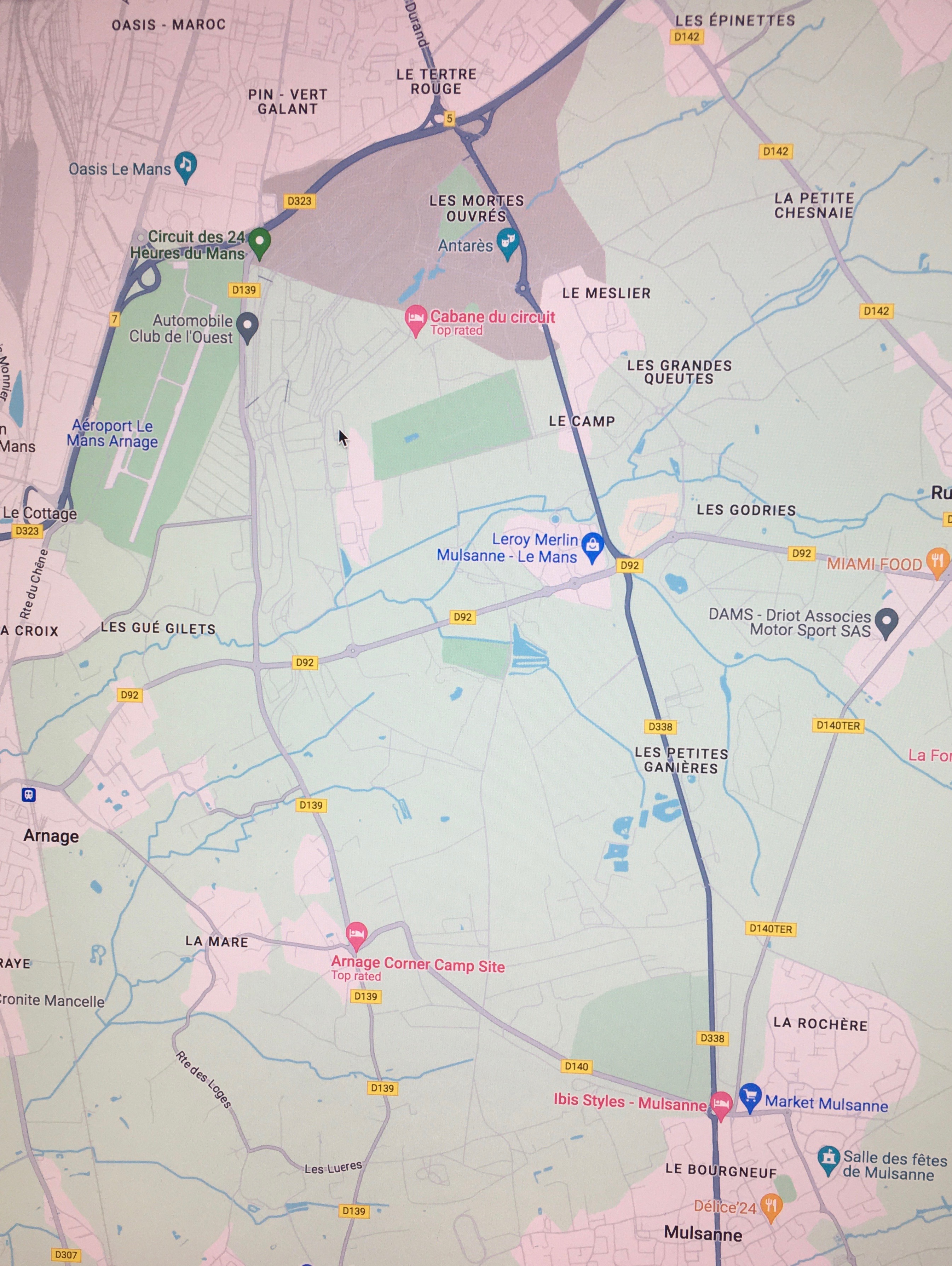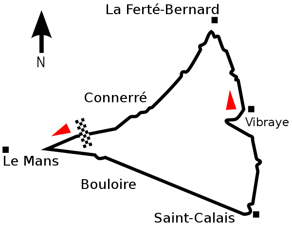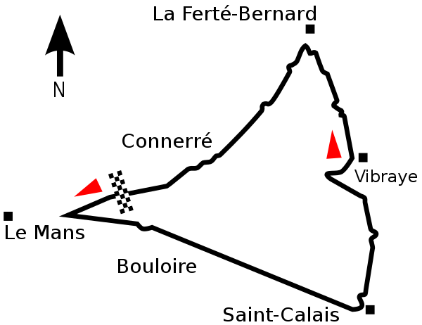 From the Automobile Club de L’Ouest follow D139 north to the edge of town, then right onto D323 to Le Tertre Rouge. Another right there onto D338 south to the village of Mulsanne. Another right onto D140 to Arnage, then onto D139 north to complete the circuit.