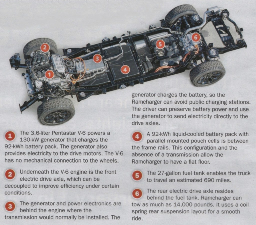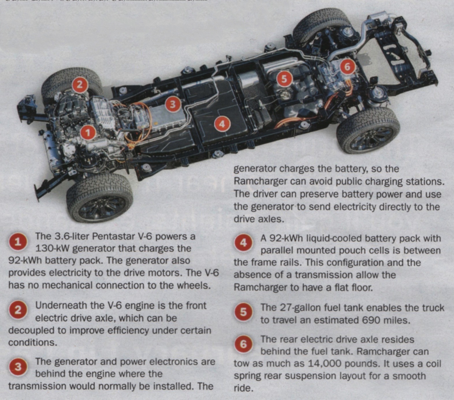 Anatomy of the Ramcharger Series Hybrid. Truett writes in Automotive News, December 11, 2023, “The 2025 Ram Ramcharger is the industry’s 1st series hybrid pickup. The 3.6-liter V-6 engine spins a generator that creates electricity to charge the 92-kWh battery pack and to power the front and rear electric traction motors.”