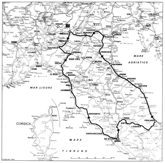 The Classic’s History. As described in Wikipedia, “The race was established [in 1927] by the young Counts Aymo Maggi and Franco Mazzotti, sports manager Renzo Castagneto and motoring journalist Giovanni Canestrini, apparently in response to the Italian Grand Prix being moved from their home town of Brescia to Monza. Together with a group of wealthy associates, they chose a race from Brescia to Rome and back, a figure-eight shaped course of roughly 1500 km—or a thousand Roman miles.” All but the 1940 running followed similar Brescia-Rome-Brescia patterns.