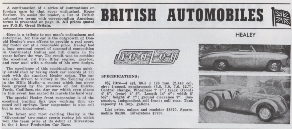 Above, R&T’s summary of Healey products in 1950. Below, amplification of the Sportsmobile. Images from R&T, February 1950 and December 1949, respectively.