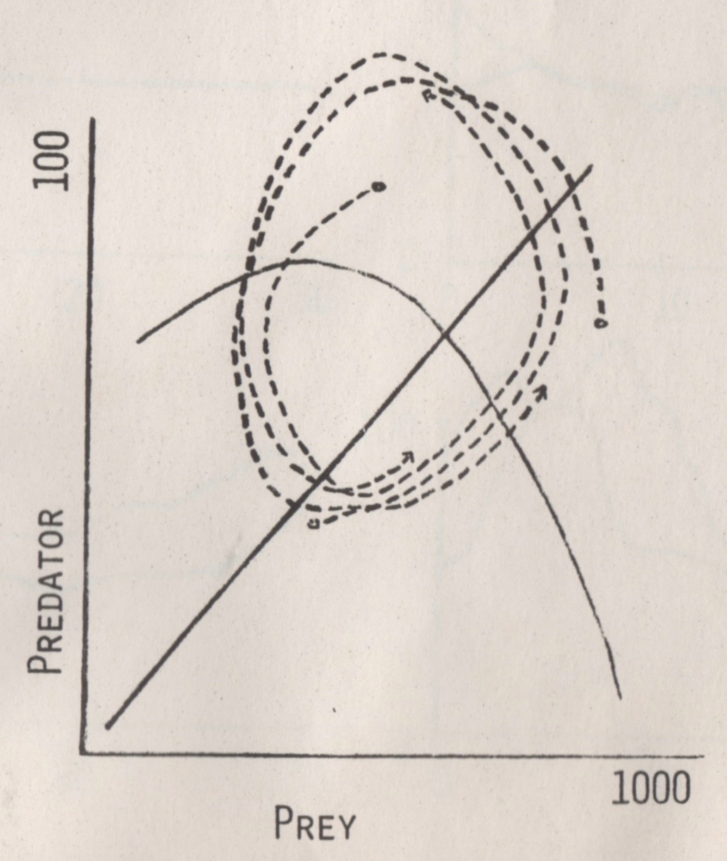A periodic outcome with specific age distributions of predator and prey. Illustration from Predator/Prey Dynamics with Age Distributions; Preliminary Report, D.J. Simanaitis and William P. MacLean, Ninth Annual Symposium on Some Mathematical Questions in Biology, 1975.