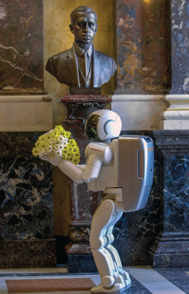 Honda robot Asimo offers flowers to the bust of playwright Karel Čapek. Image from Science, January 12, 2024.