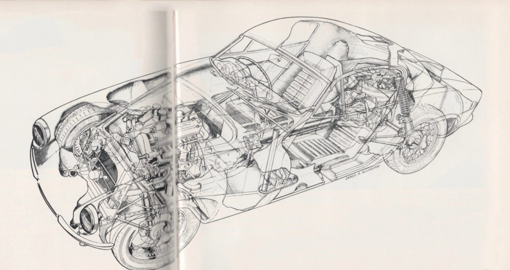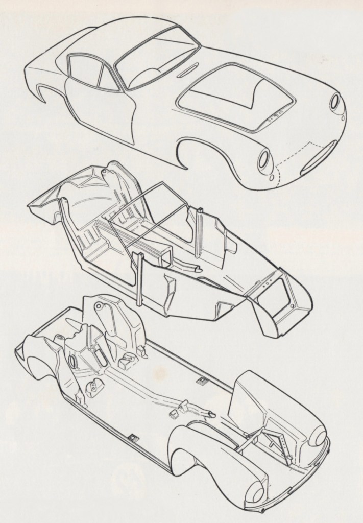 Portions of each moulding had varying thicknesses based upon the loads they carried. As an example, Phipps noted, “The rear diaphragm completes the structure in this area, coupling the body sides and the tunnel by means of a beam. The rear suspension unit pickups are located at the top corners of this beam and the final drive is mounted in the centre of it; in this highly loaded area the glass-reinforced plastic is 3/8 in. thick, tapering to 3/16 in. and finally 1/8 in.”