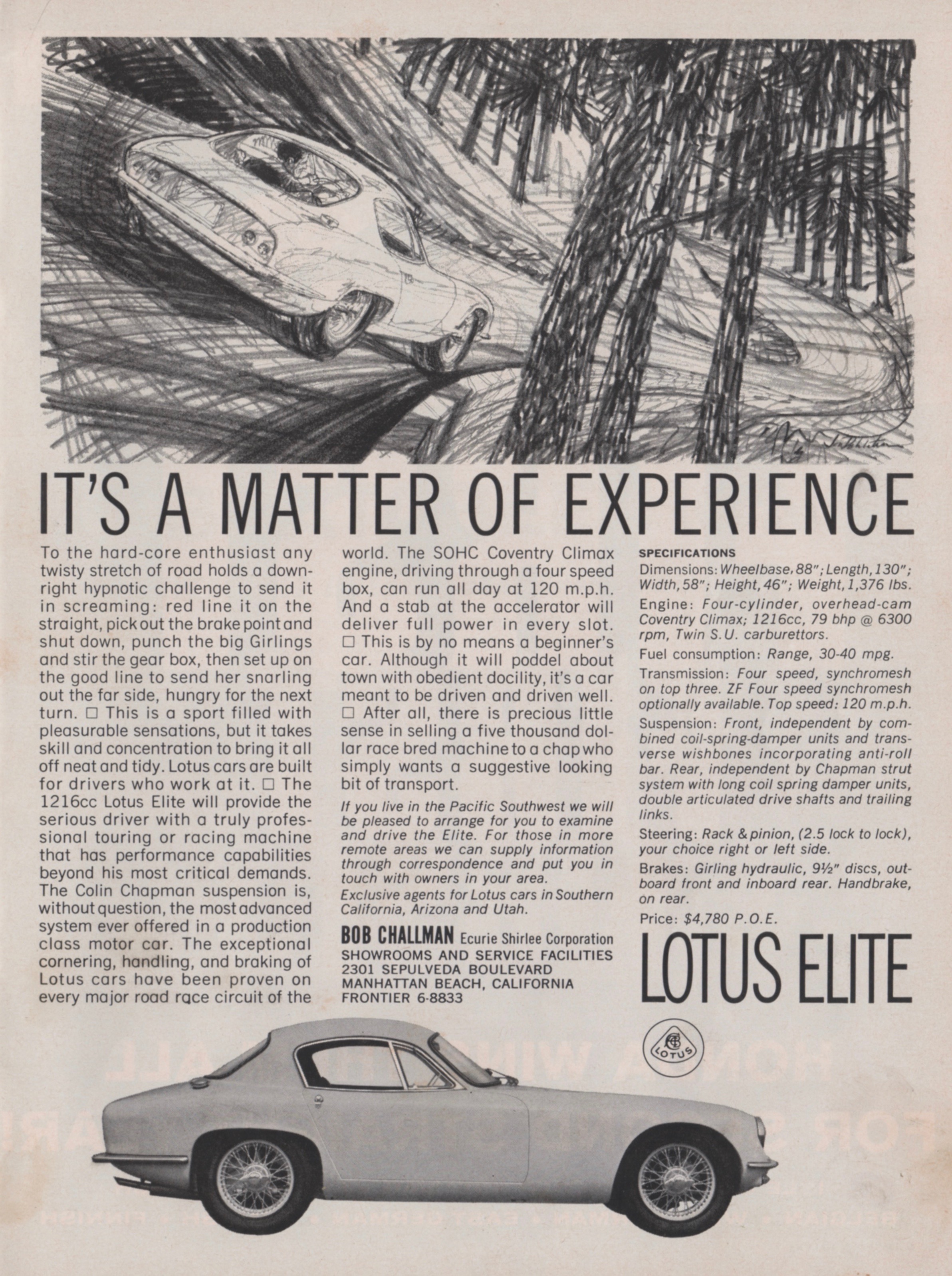 The April 1963 issue of R&T had a road test of the Elite; indeed, the second in less than four years. And I just happen to have Classic Cars in Profile Volume 2, which contains David Phipps’ article about the Lotus Elite. Here in Parts 1 and 2 today and tomorrow are tidbits about this car gleaned from these two sources, from my usual Internet sleuthing, and from my own recollections of the car.