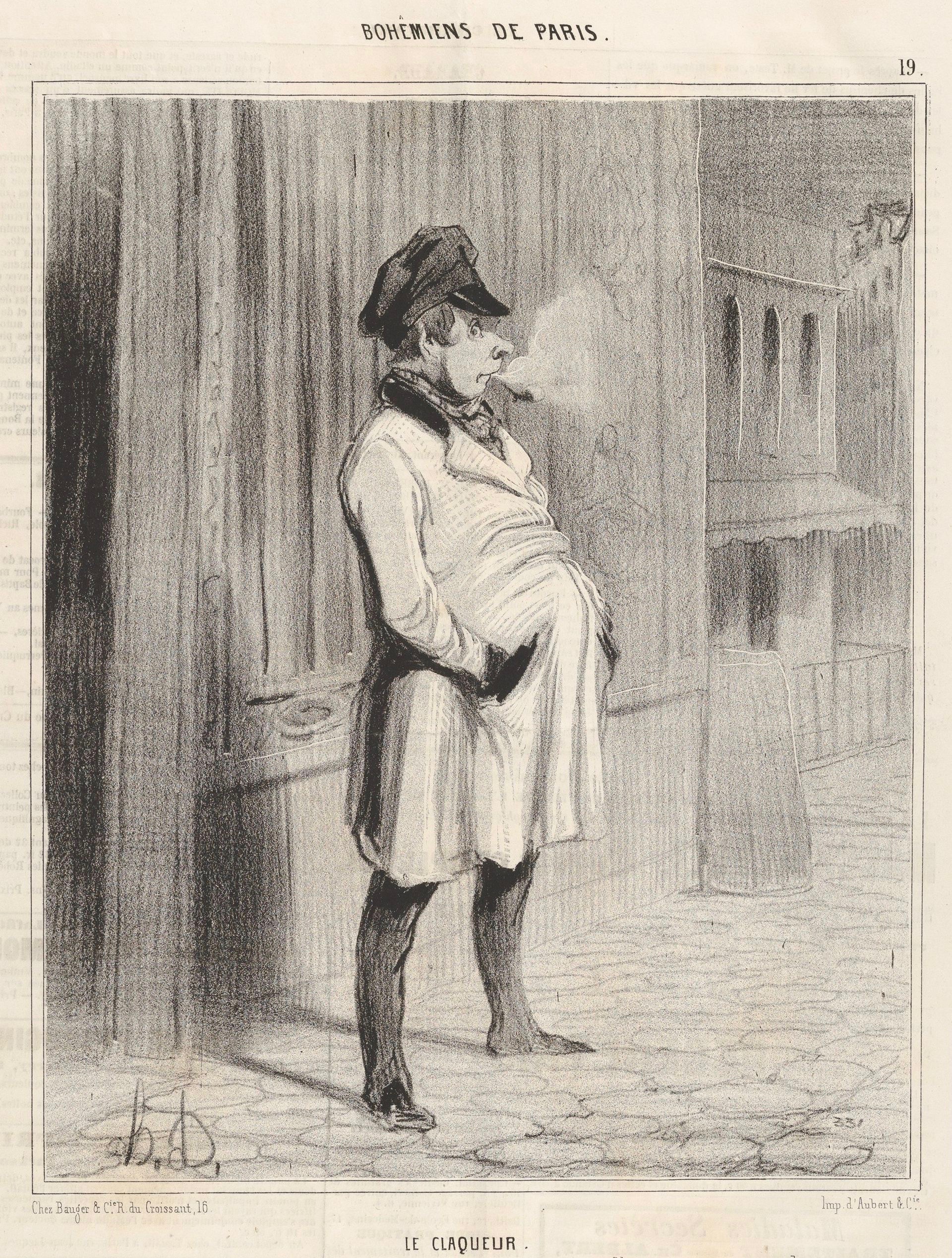 Le Claqueur, by Honoré Daumier, 1842. The job: Burst out laughing with the comic, cry with the heroine, and defend the author. Image from Wikipedia.