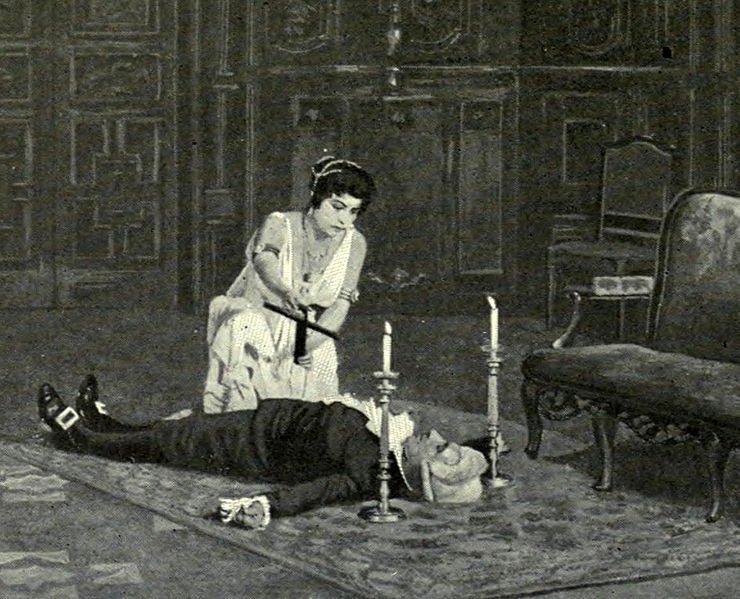 Tosca, the harrowing end of Act II. Image from the Metropolitan Opera, c.. 1910.