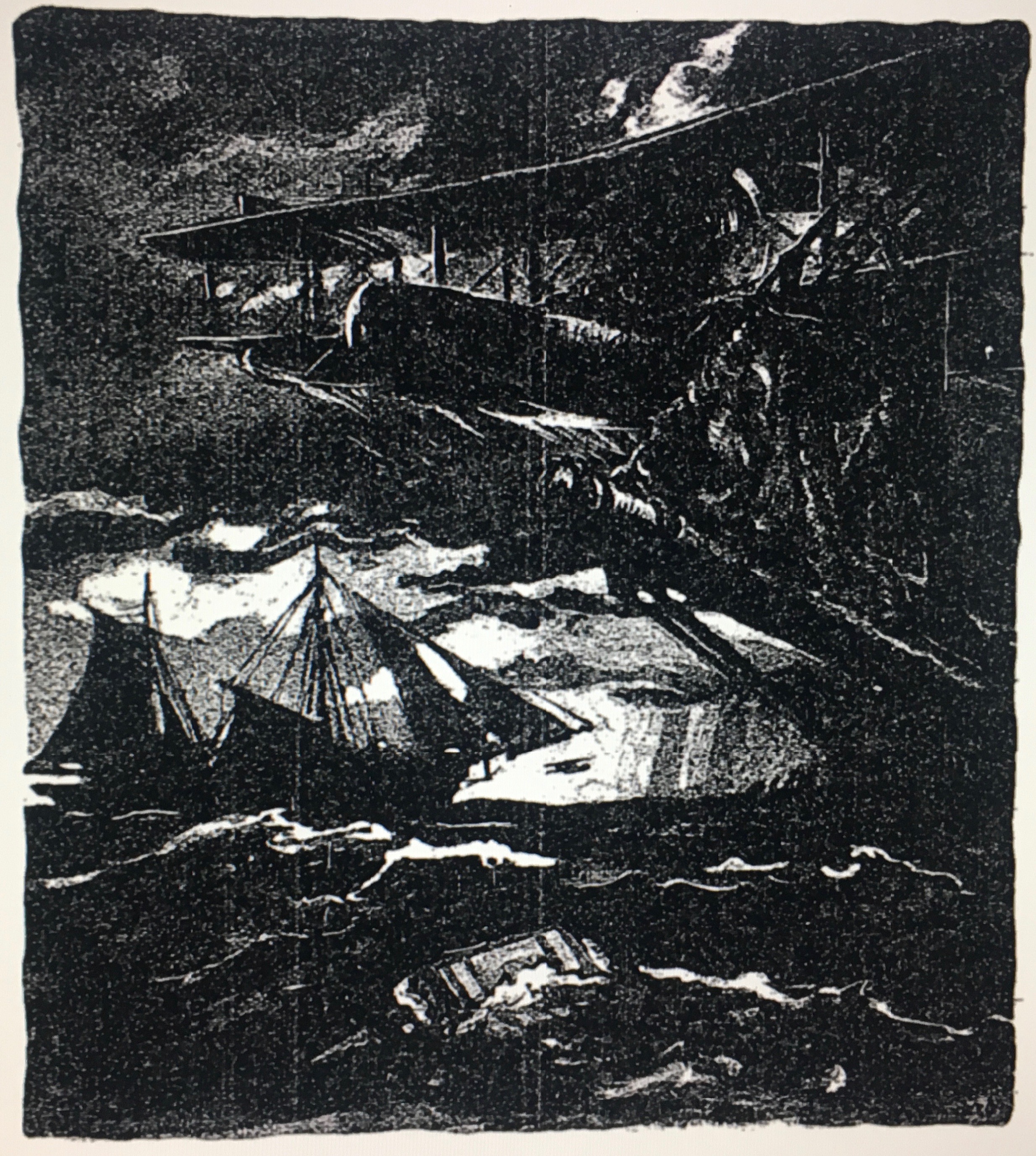 Even this passive activity was fraught with adventure: In one instance, Mingos related, “Once over the rum fleet the spotter was trying to signal the schooner with which he wanted to communicate. At that point the engine played out and the little machine came down on the waves which were then being kicked up with a wicked wind.”