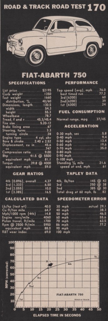 “Other changes,” R&T recounted, “include a lightened flywheel, heavier clutch springs, a larger radiator and a change in final drive….” Various engine tunes gave the Abarth 750 outputs from 38 to 47 bhp. The test car sported 41.5 at 5500.