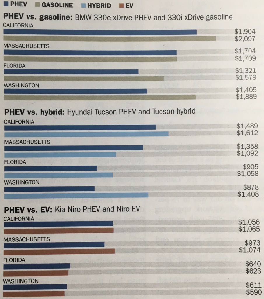 Will a PHEV Save You Money? “Consumer Reports” says Automotive News, “analyzed the fuel costs of conventional hybrids, plug-in hybrids, and battery-electric vehicles in California, Massachusetts, Florida, and Washington…. The firm considered consumers who drive 40 miles a day, charge their EVs and PHEVs each night, and take four 500-mile road trips annually.”