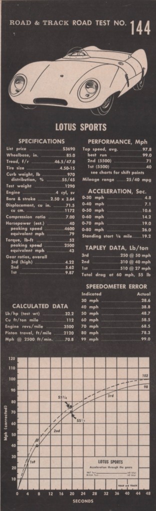 More Power Available. “In order to show the range of performance which can be expected from a modified Lotus Sports,” R&T recounted, “we have plotted the results of a British test in dotted lines against our usual acceleration graph. However, the overseas car carried a test weight approximately 200 lb below our figure, and the engine had quite a few internal modifications, including higher compression ratio, polished ports and oversize valves…. Accordingly, we have estimated that our car had about 40 bhp as compared to 45 or so for the more modified machine.”