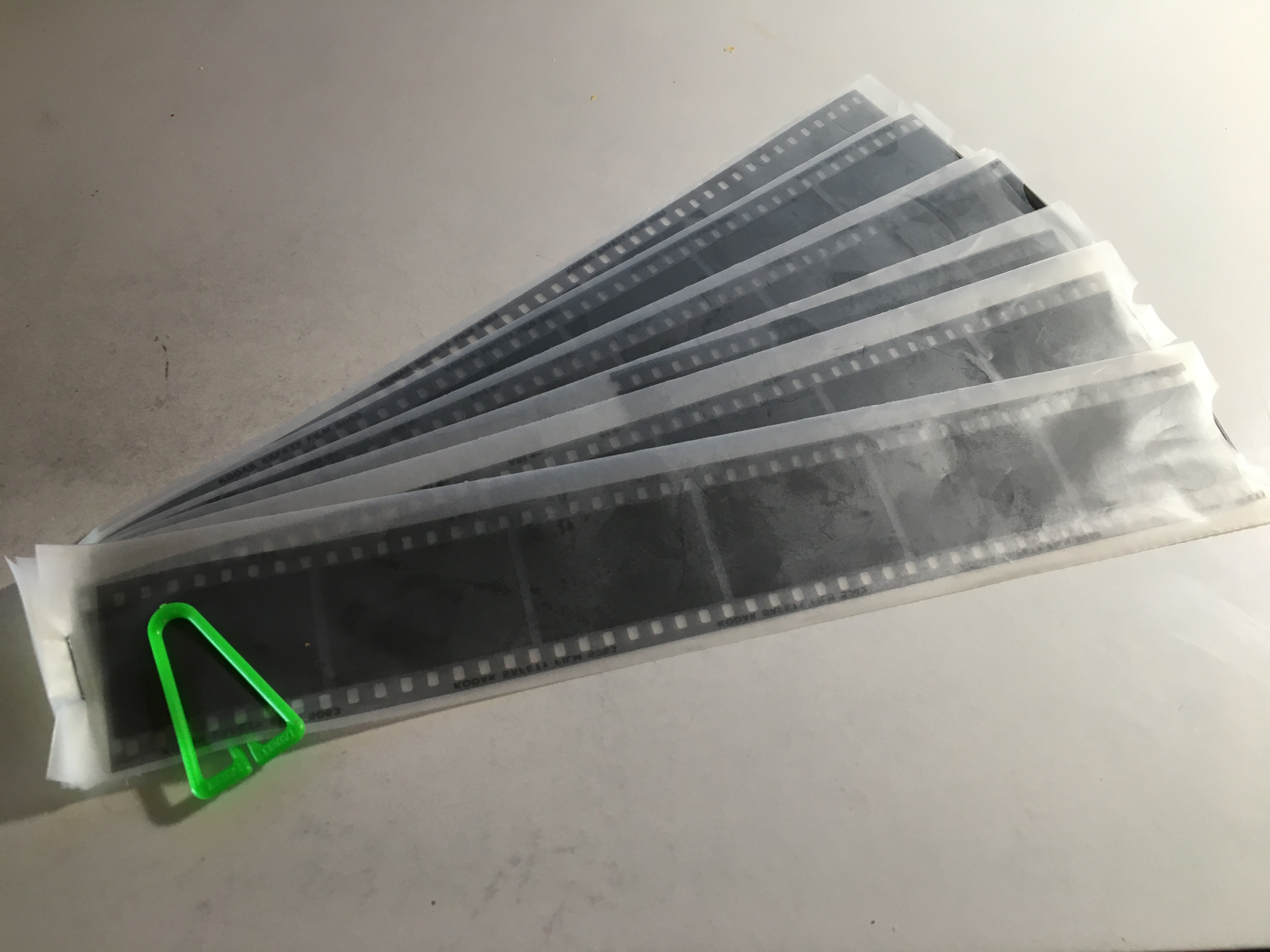 Above, as delivered. Below, six strips of negatives of Kodak Safety Film 5063.