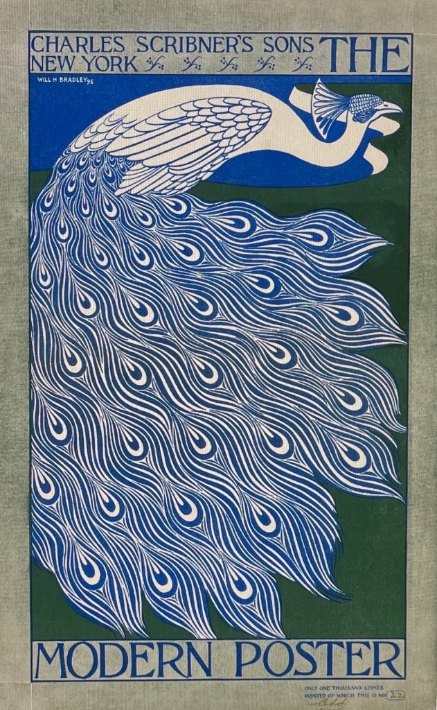 Above, according to my Baedeker’s Northern France, 1894, 10 centimes was only 2¢ U.S., quite a bargain. Below, this lush bird is identified as the work of Will H. Bradley, 1895.
