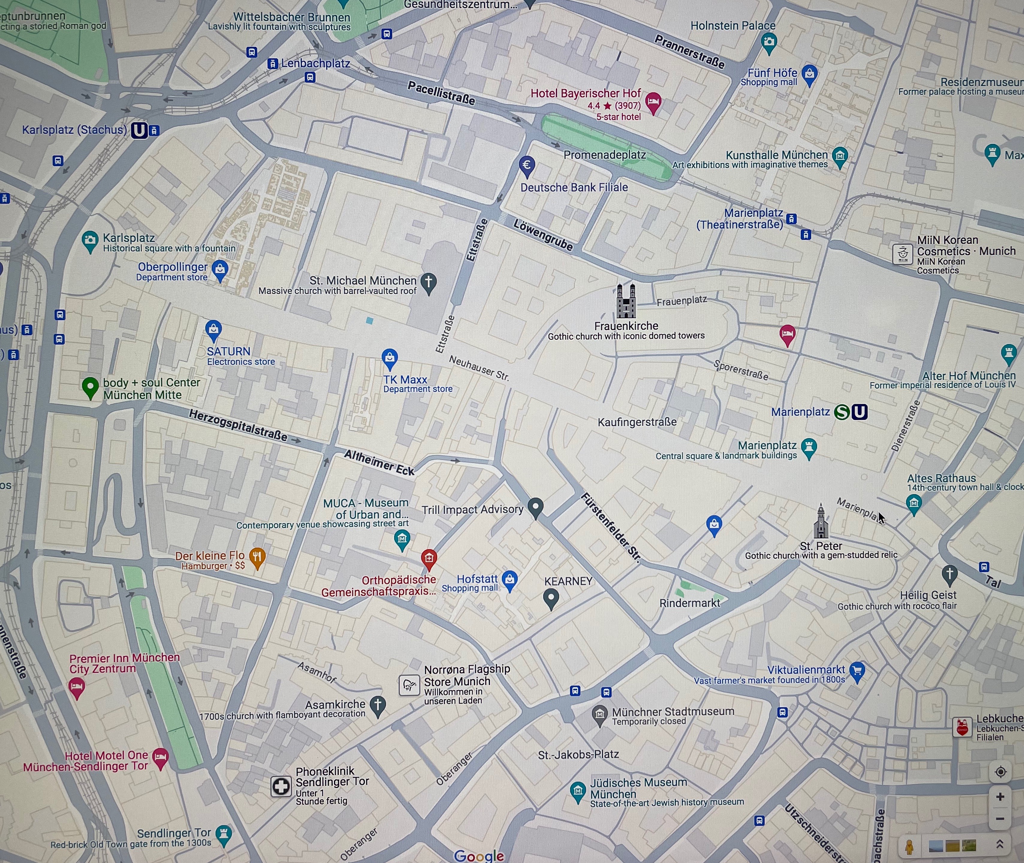 Marienplatz Strolling. Marienplatz is part of a giant pedestrian mall in central Munich extending from Karlsplatz on the northwest to the Viktualienmarkt and beyond to the southeast. Kaufingerstrasse is aptly named (“buyer’s street”). It’s where I found numerous neat CDs at Ludwick Beck department store, my first pair of large perfectly round glass frames, and other assorted goodies. Just northeast of Marienplatz is Haxnbäurin and its scrumptious Schweinhaxe (rotisserized pork knuckle).