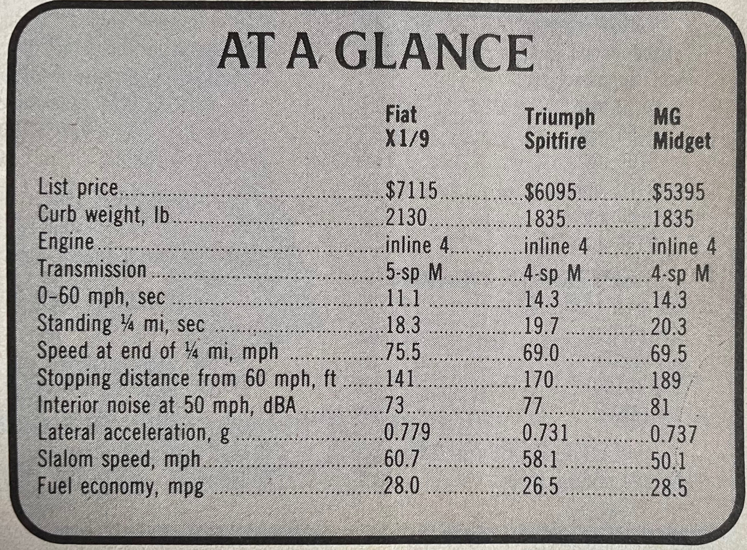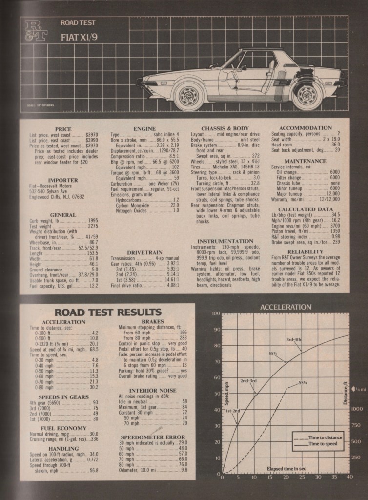Any tradeoff in fuel economy? Not major: “Where our most recent 1290-cc X1/9 exhibited fuel economy of 30.5 mpg, we found the new car consuming its fuel at a still thrifty 28.0 mpg.”