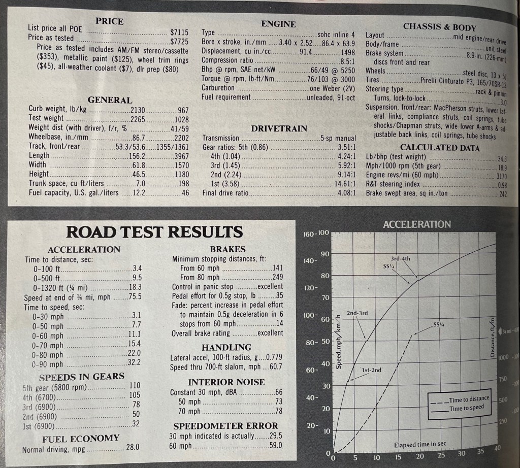 “The ride, handling, and roadholding are all great, with the usual Fiat expertise applied to the always potentially outstanding mid-engine layout…. The Michelin XAS radials of the test car must share credit with the chassis for the Fiat’s outstanding road manners; their grip is always phenomenal relative to their size.”