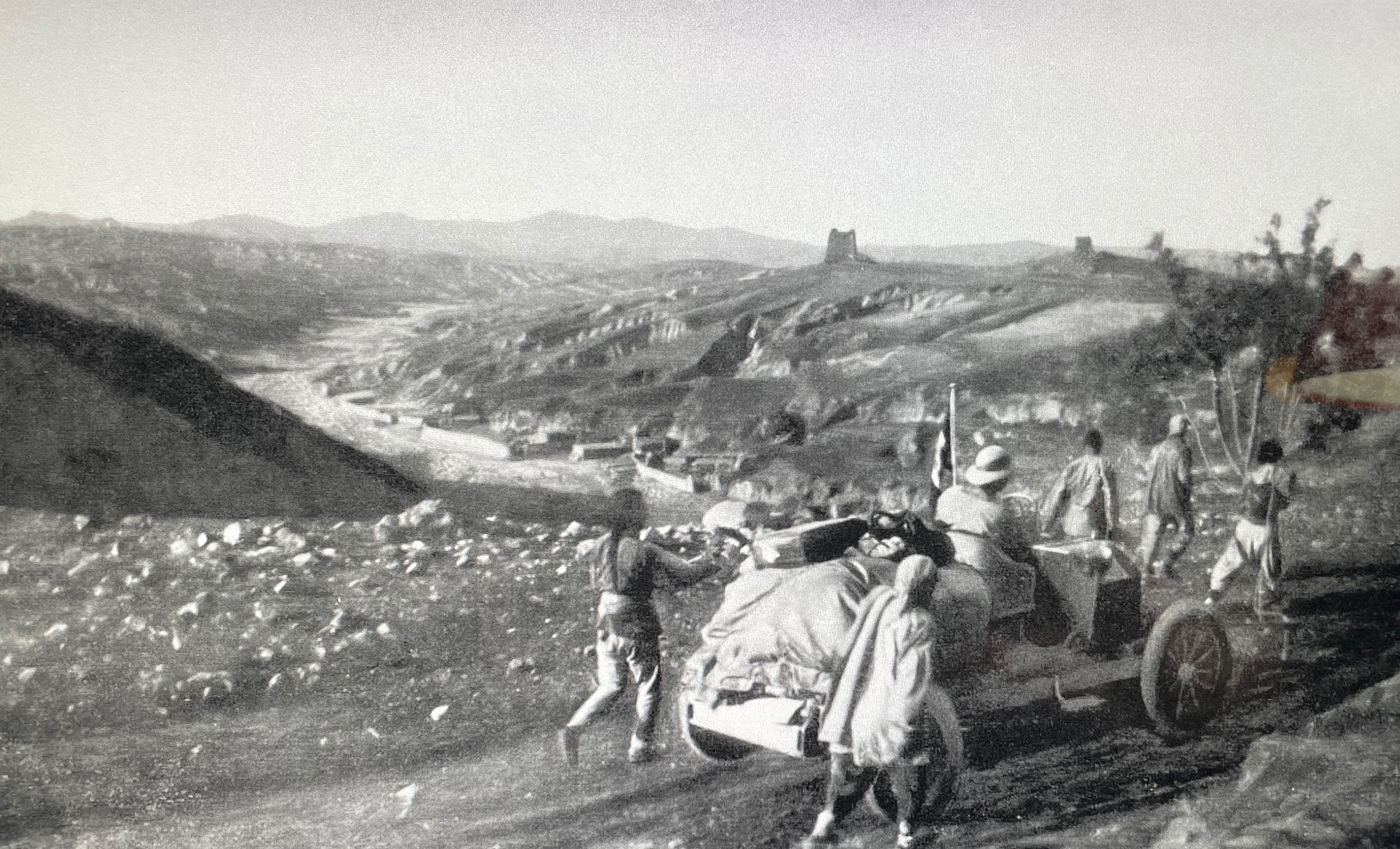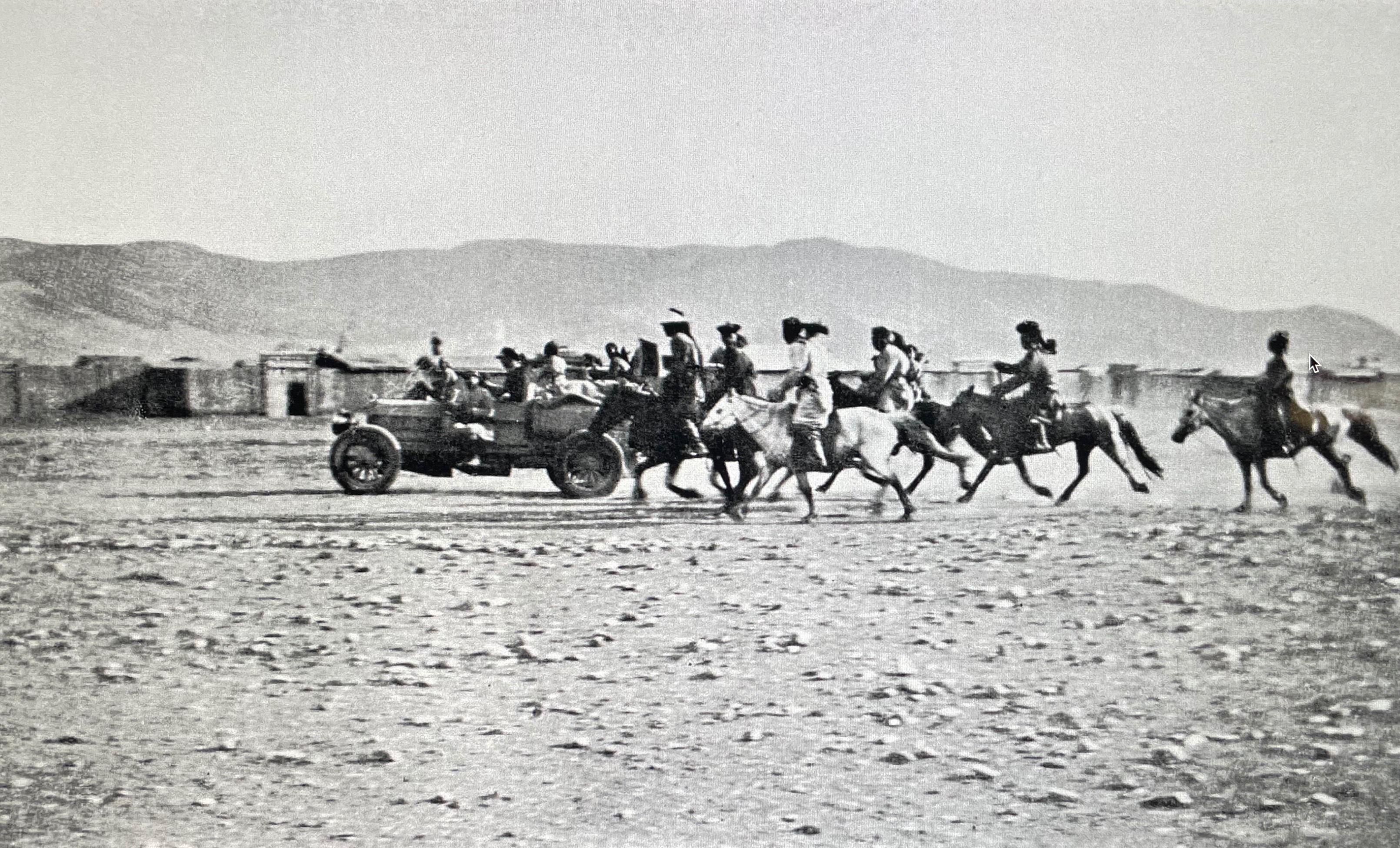 “This exhilarating shot captures a merry scene, when the governor of Mongolia took a ride in the ‘Italia.’ ”