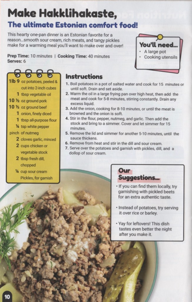 Not to Ignore Estonia and Latvia. I’ve focused here on my ancestral homeland, but Universal Yums includes tidbits about Baltic neighbors as well: There’s a recipe for Estonian Hakkliakaste, a one-pan dinner of ground pork and beef, onion, flour, nutmeg, garlic, chicken or vegetable stock, dill, sour cream, with pickles as garnish.