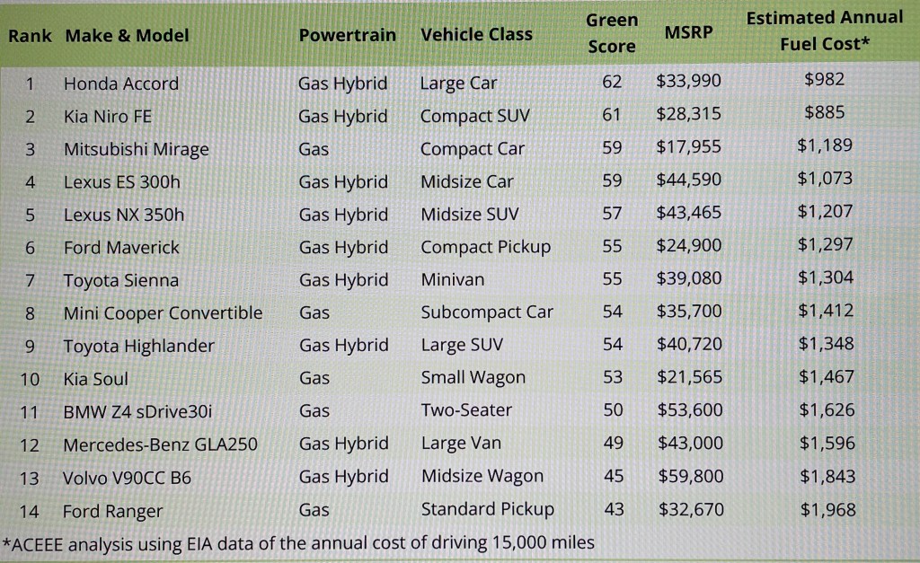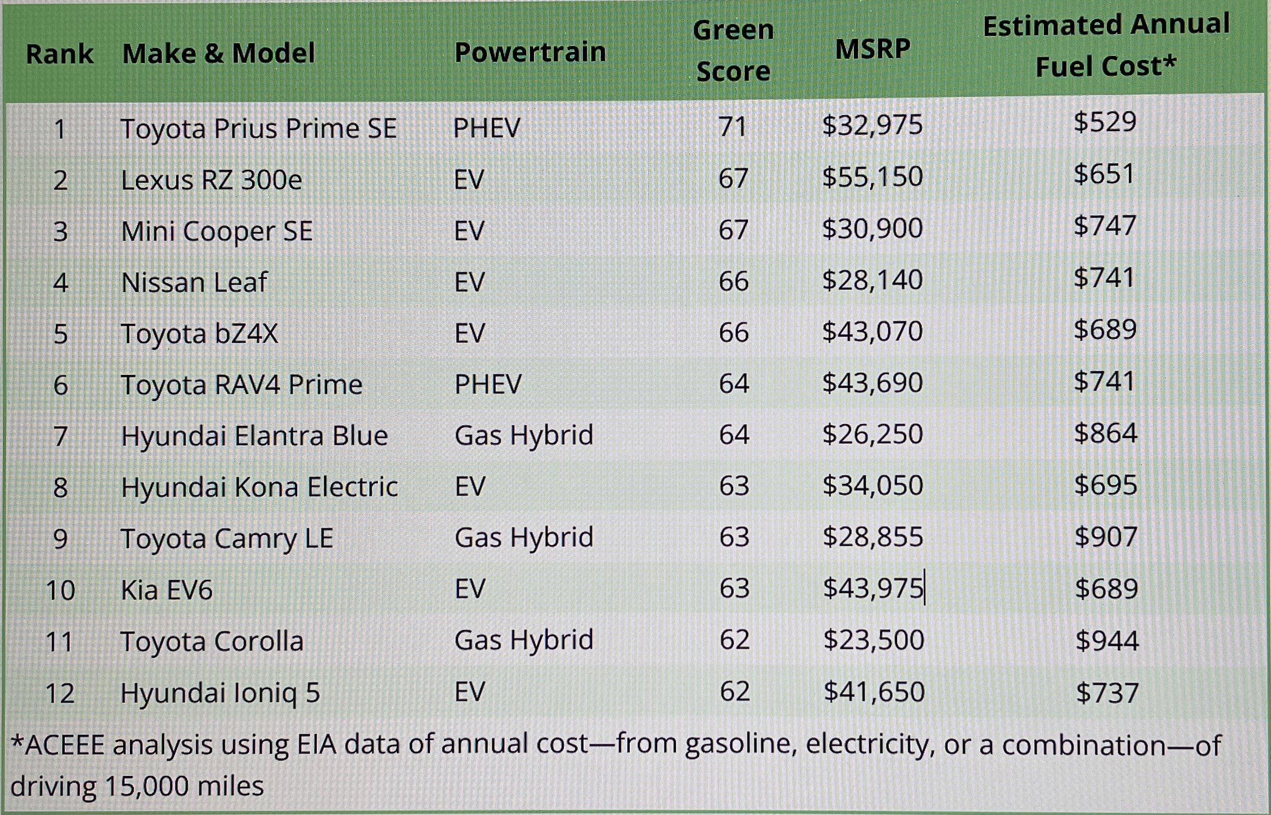 The Greenest of the Green. This and following lists are from the ACEEE. An abbreviated version of this one appeared in Automotive News, March 18, 2024.