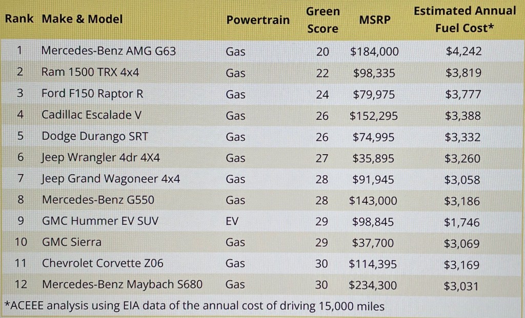 Back to ACEEE: Who Populates the Bottom of the List? Lutz writes, “The lowest-scoring vehicles were a mix of gasoline-powered SUVs, such as the Mercedes-Benz AMG G63, Ram 1500 TRX, Cadillac Escalade V Series and Ford F-150 Raptor R. But for the first time, an EV earned one of the lowest scores: the GMC Hummer.”