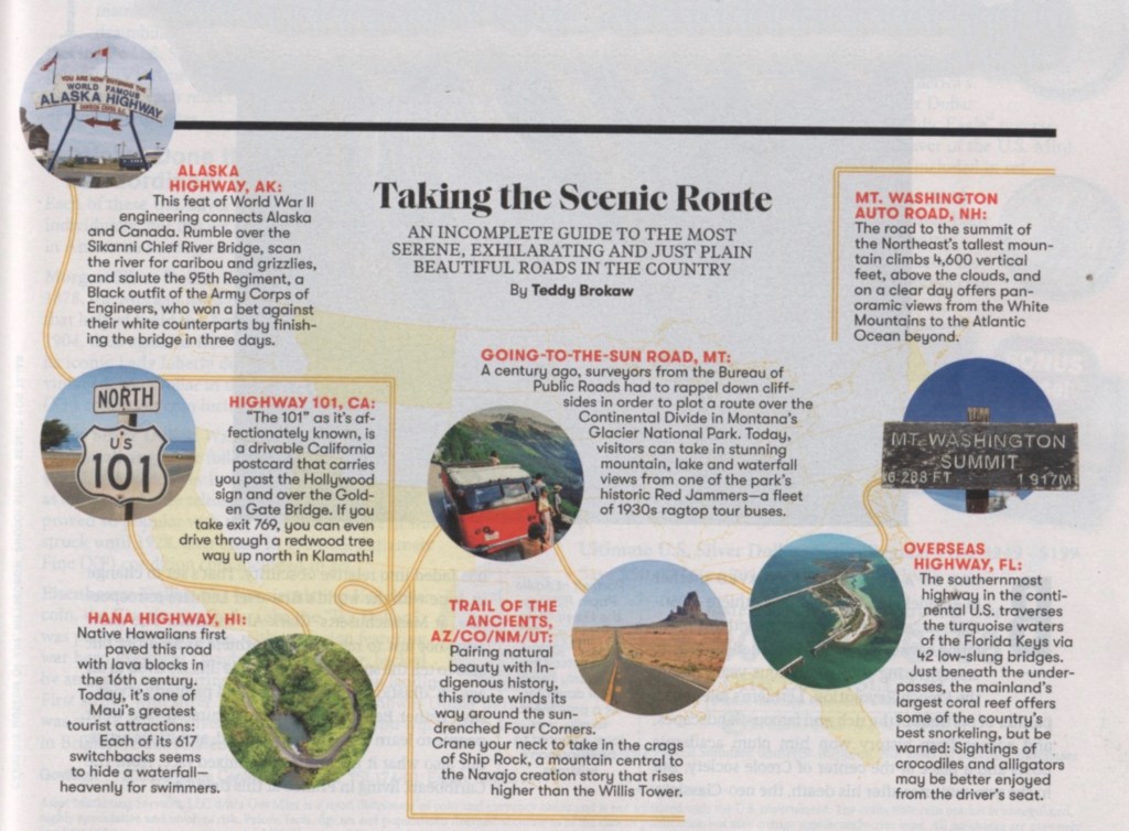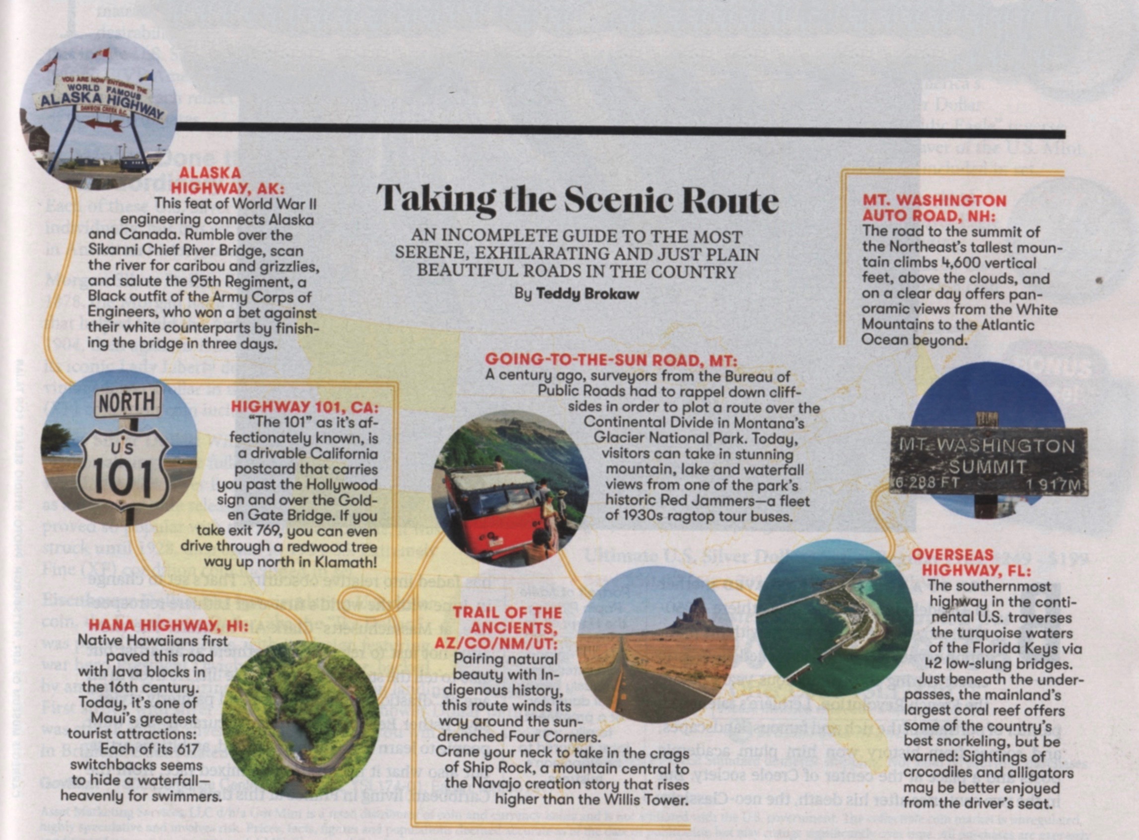 Highway 101, CA. “ ‘The 101,’ as it’s affectionately known,” Brokaw says, “is a drivable California postcard that carries you past the Hollywood sign and over the Golden Gate Bridge.”
