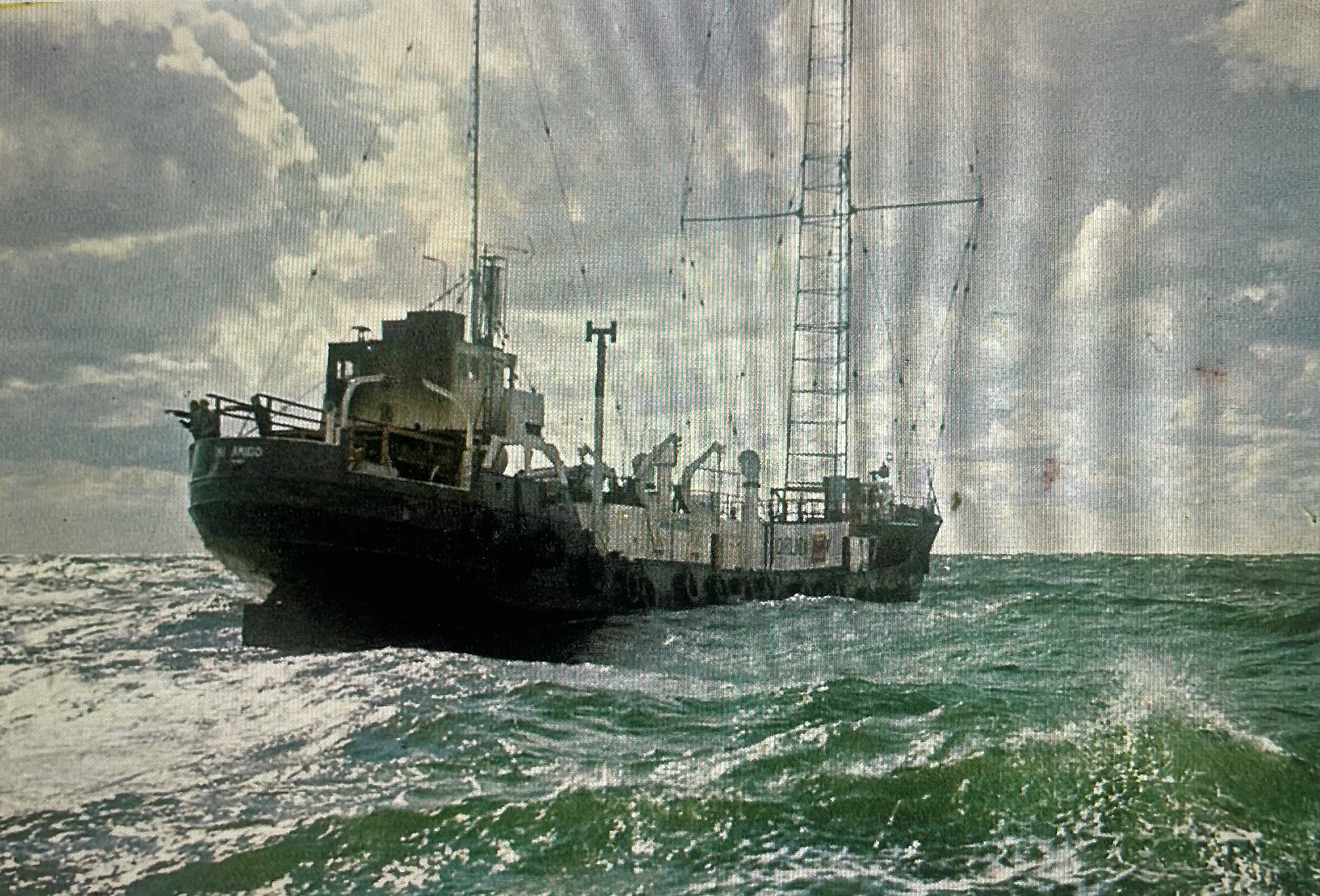 The Caroline Mi Amigo at sea in the 1960s.