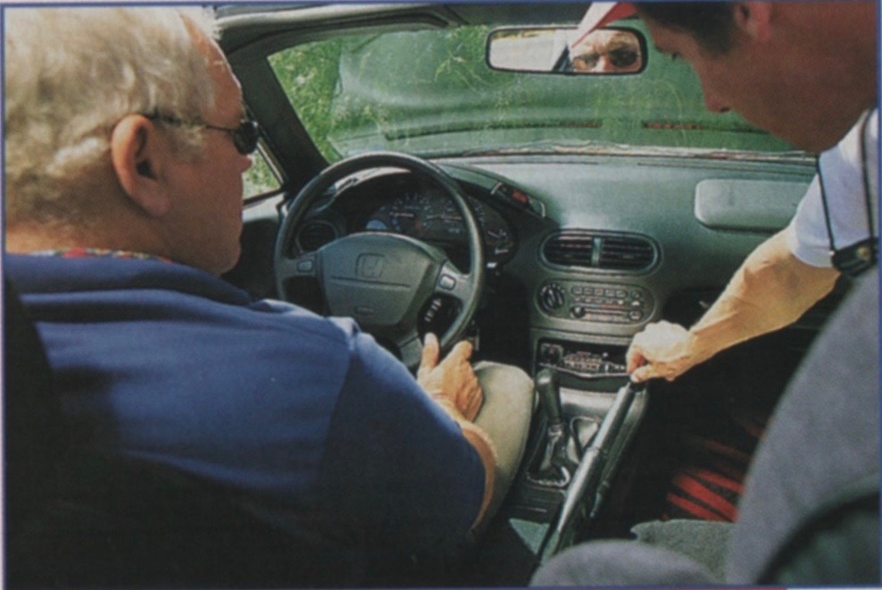 Above, “I like the Miata’s driving position, its shift linkage, its dashboard. Wanna try on the gloves, Kim?” Below, “The del Sol’s is such a functional comfortable interior. And if you must have noise, just hang your head out the window.”