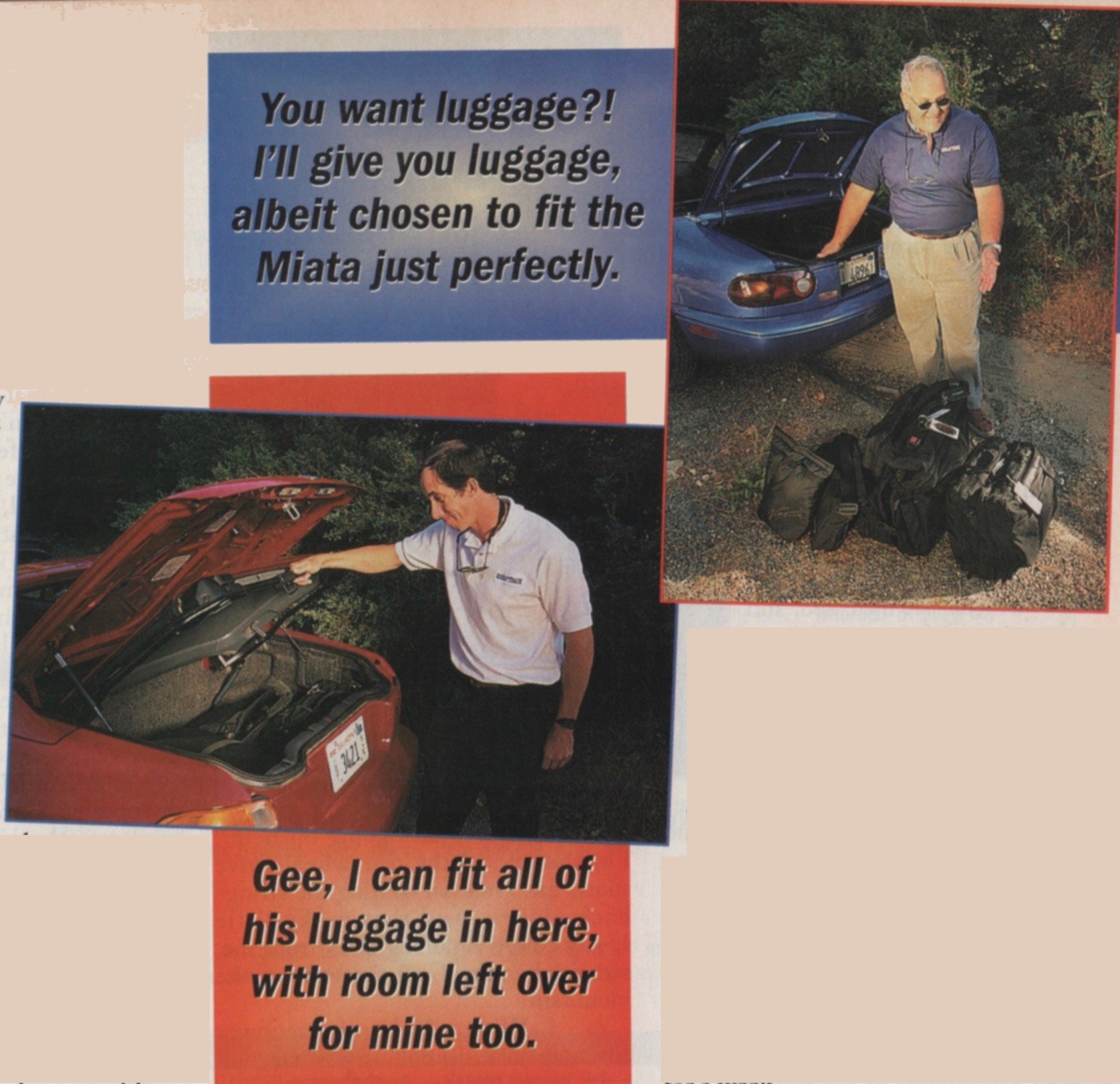 Trunk Space. Full Disclosure: Wife Dottie and I had bought R&T’s Long-Term Miata after its 50,000 miles, and thus had formulated exactly the size and shape of optimal traveling baggage. Take that, Kim!