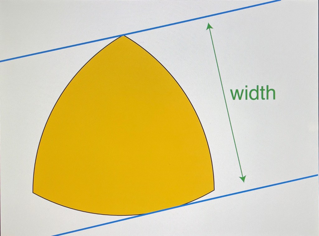 A REULEAUX TRIANGLE, according to Wikipedia, is “a curved triangle with constant width, the simpliest and best known curve of constant width other than the circle.” By the way, it gets its name from Franz Reauleaux (“Ro-lo,”) a 19th-century German engineer who found its constant width helpful in his mechanical designs.