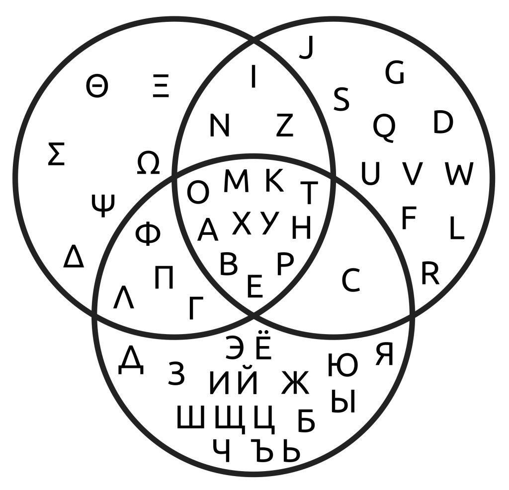 An interesting Venn diagram in Wikipedia  shows the upper-case characters common to the Greek, Latin, and Cyrillic alphabets. As Watchduck happened to size the circles equally, a Reuleaux triangle is their common intersection. ds