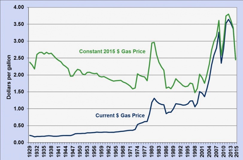 These graphs show U.S. average gasoline prices from 1929 to 2015. The green line is normalized to 2015 dollars. Image from energy.gov.