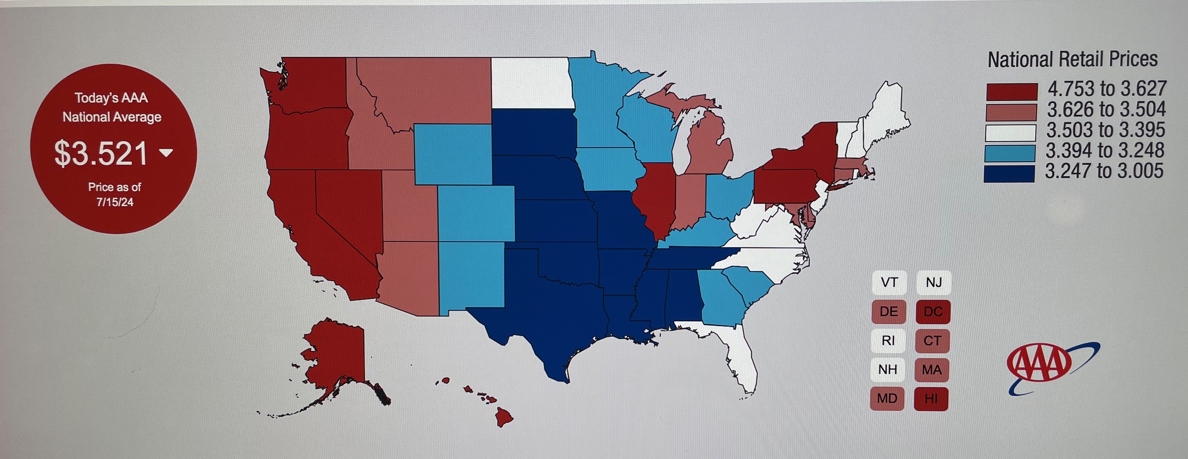 “RFG,” EPA continues, “is required in cities with high smog levels and is optional elsewhere. RFG is currently used in 17 states and the District of Columbia. About 25 percent of gasoline sold in the U.S. is reformulated.” You’ll note the more expensive gasoline prices in the AAA map corresponding to these cities.