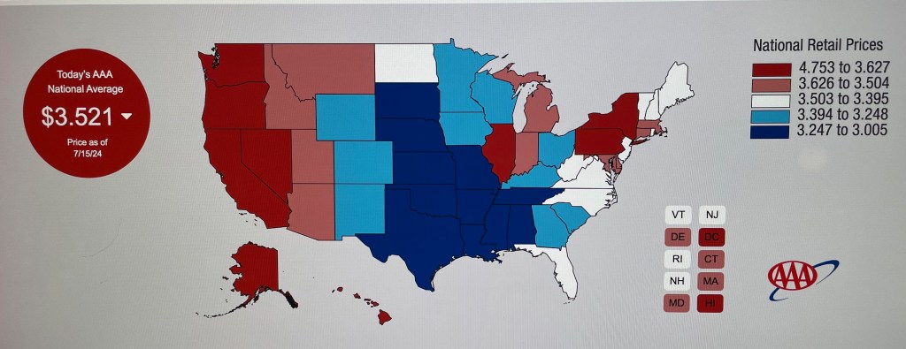 HistoryFacts is Spot-on. If you’re filling up today with anything but California’s Phase 3 Reformulated gasolines (of which more anon), the website is spot-on with AAA’s national average of $3.521 for regular. Mid-grade is a tad higher, $3.968; Premium, $4.314.