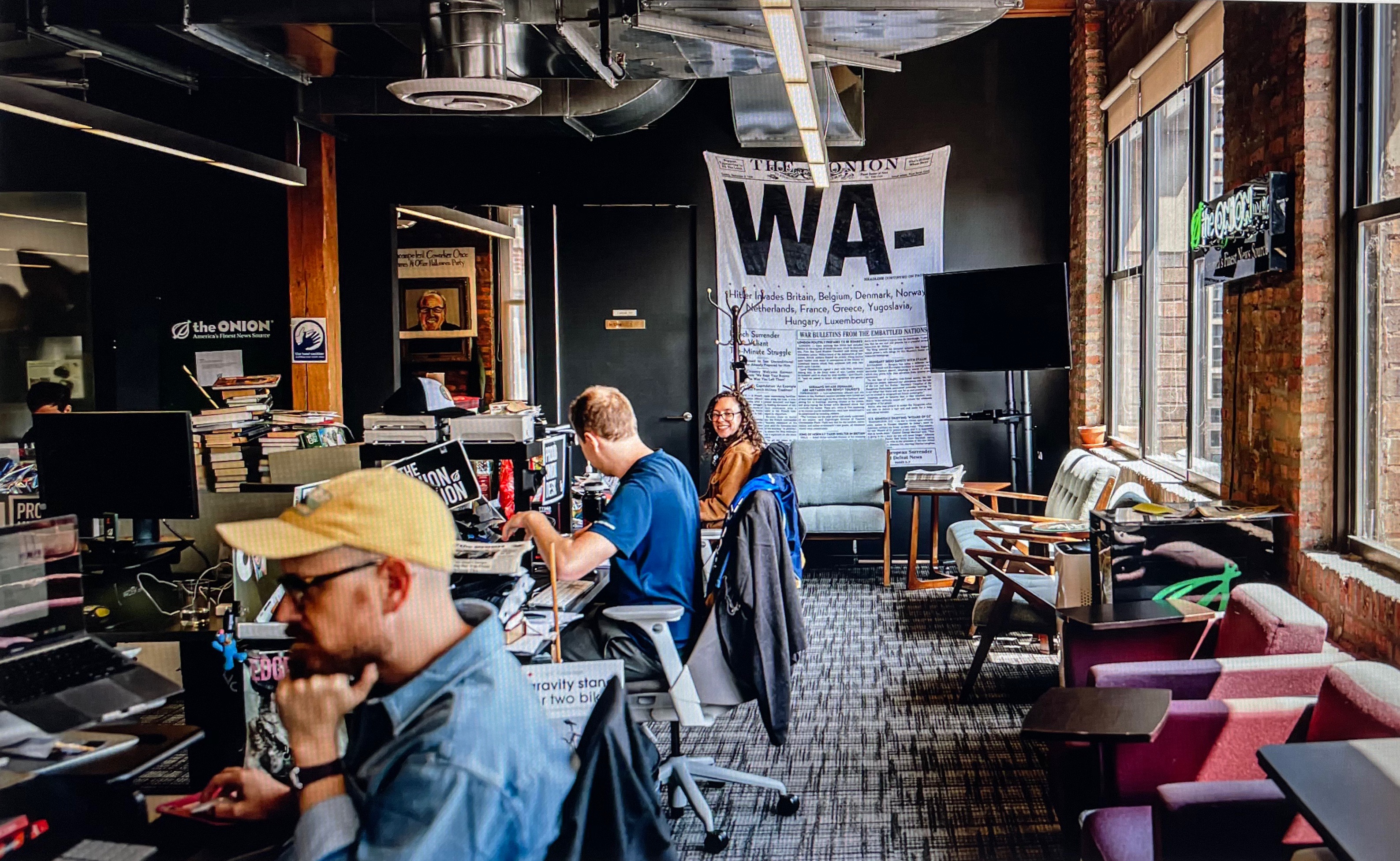 Above, perfectly normal-looking people (no slur intended) work at The Onion. Below, a montage of its Chicago headquarters. Images from The New York Times.