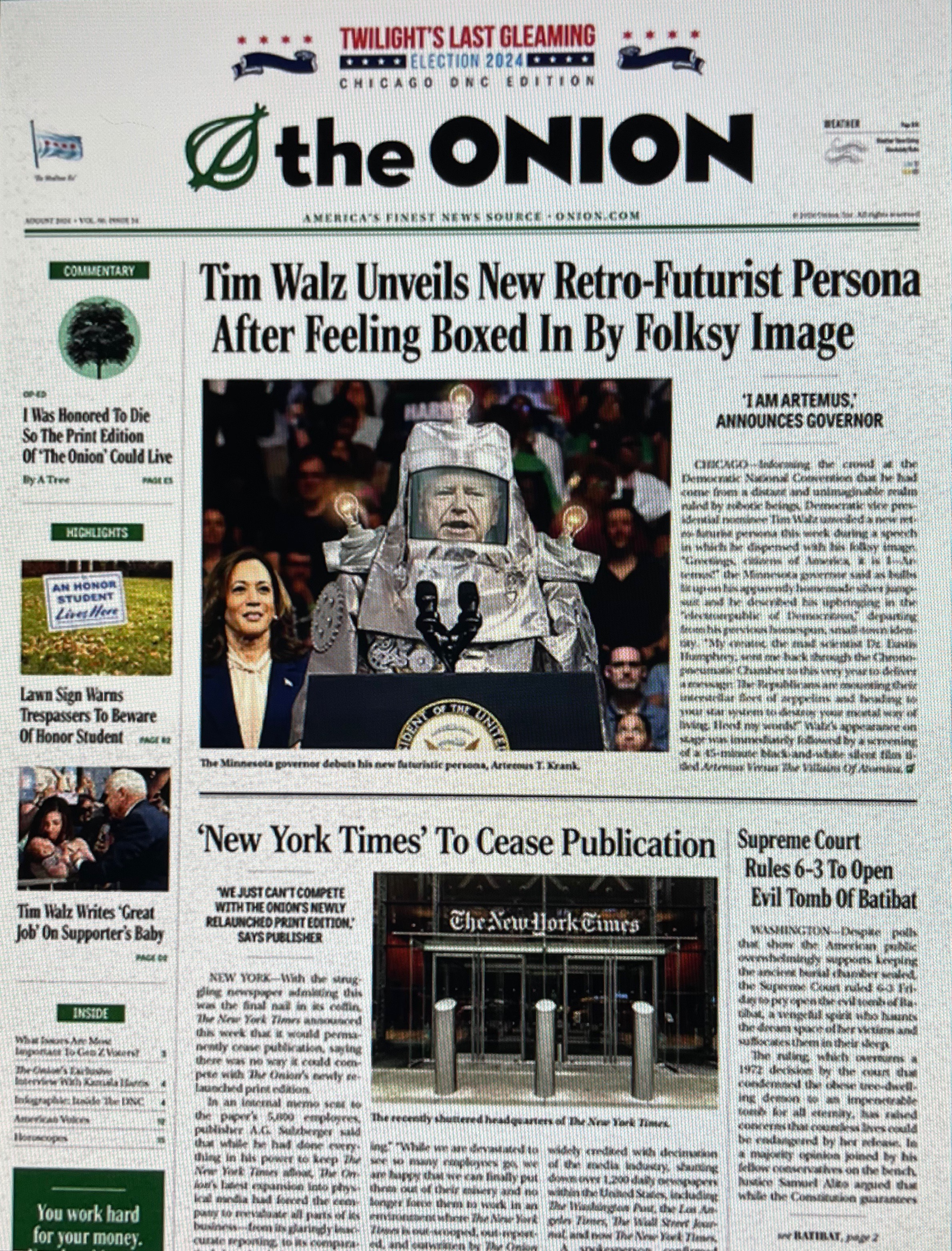 Equal Opportunity Satirists. Though I suspect I’m among friends, The Onion pokes fun at all sides: “RFK Jr. Offered Multiple Positions In RFK Jr.’s Administration, RFK Jr. Reports.” And Tim Walz’s “I Have Killed, And I Will Kill Again.”