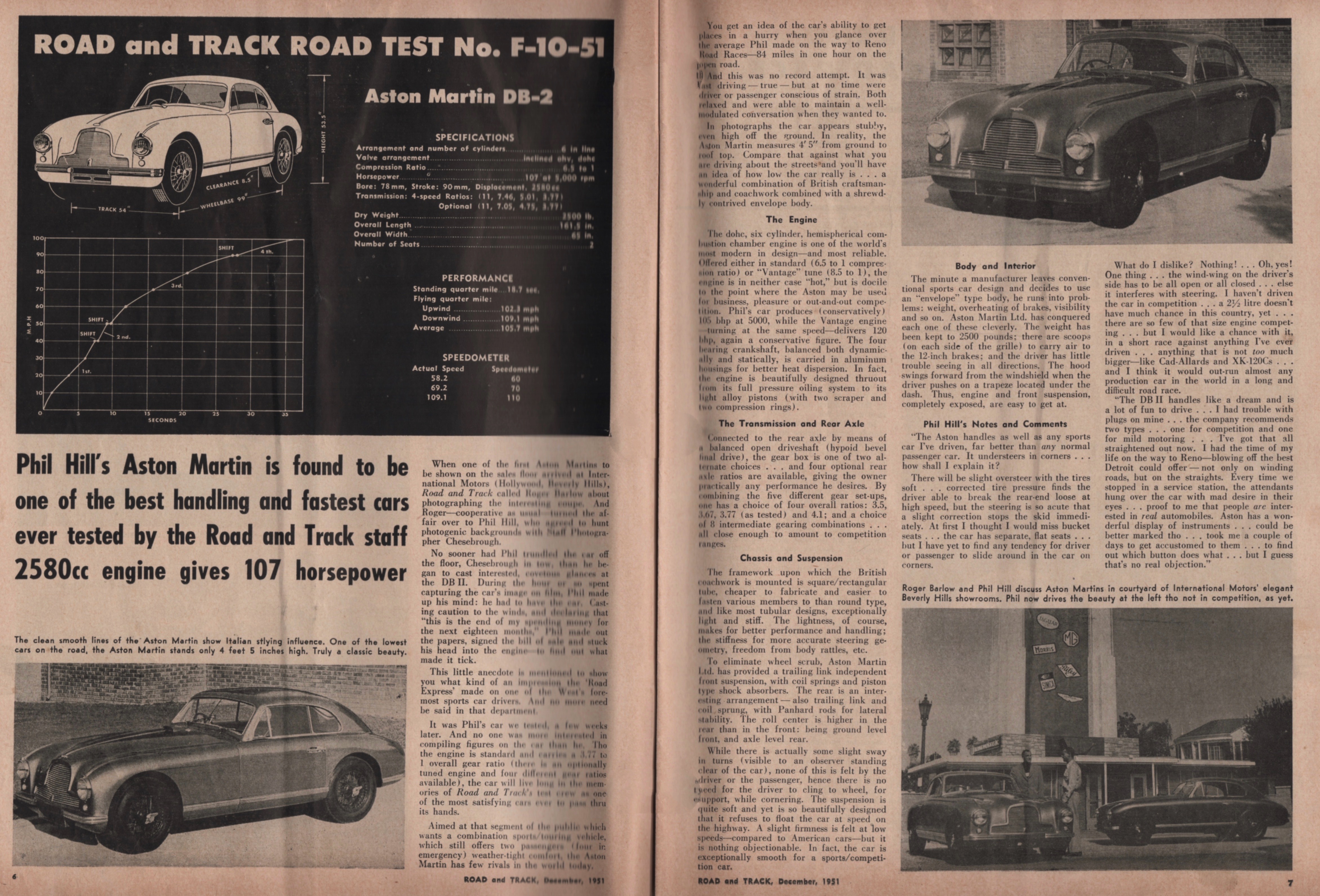 Phil’s Comments. R+T dropped its earlier anonymous Messrs. to have Hill provide Notes and Comments: “The DB II handles like a dream and is a lot of fun to drive…. I had the time of my life on the way to Reno—blowing off the best Detroit could offer—not only on winding roads, but on the straights.”