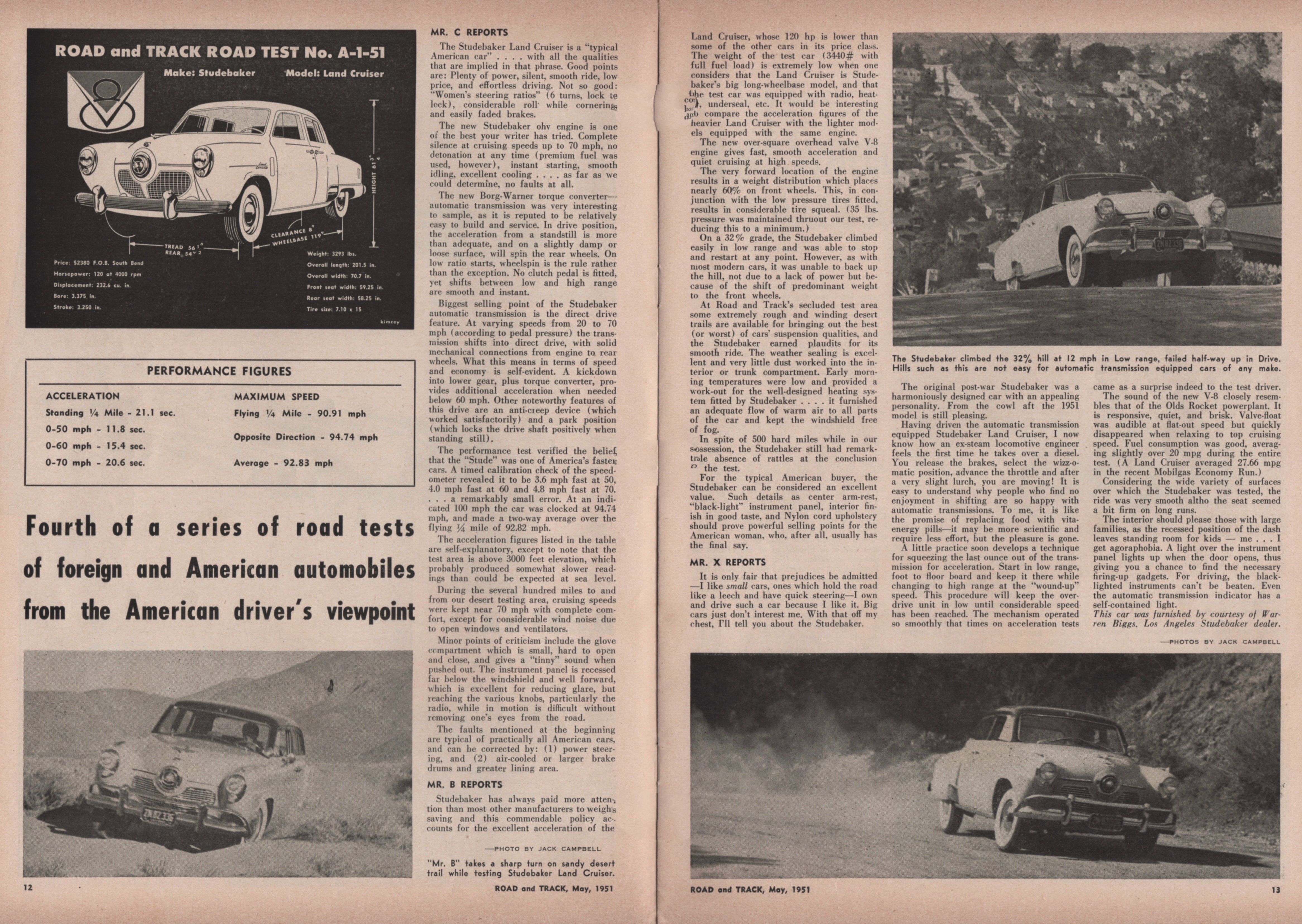 Studebaker Land Cruiser. The Studebaker Land Cruiser test had the same format and multiple staffers as the Jaguar’s (with top-speed excitement replaced by probing handling limits of an American car). That’s Mr. B. along a sandy desert trail.