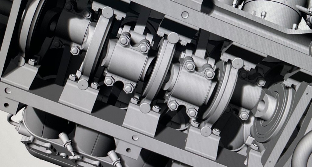 The Napier Lion’s “broad-arrow” three banks of four cylinders have pistons and other components formed by 3D printing. Below, the engine’s bottom end with sump removed. These and the following from Haddock’s 71-page pdf on “Building a 1:8 Scale Napier-Railton Race Car.”