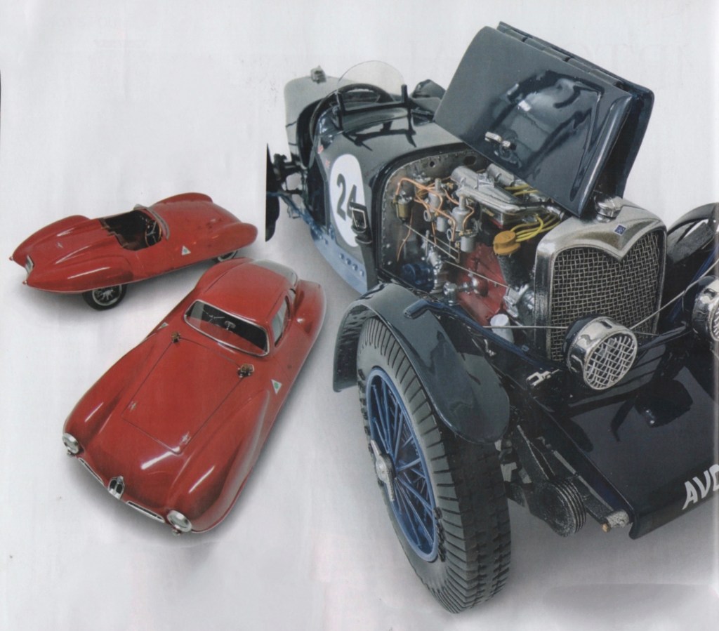 Martinez-Fresneda works in a variety of scales: Several of his commissions are rendered in 1:18 scale, like these 1952 Alfa Romeo 1900 C52 Disco Volante Coupé and Spider. The 1936 Riley 1 1/2-Litre TT Sprite Competition Sports is 1:12 scale. This and the following image from Classic & Sports Car, July 2024.