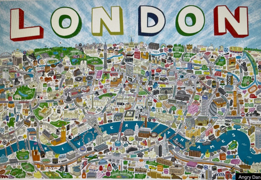 Angry Dan’s London. Tim Stokes describes in BBC News, “Angry Dan spent more than six months on the illustration, which features more than 850 landmarks and people—everything from Roman remains and world-renowned museums, to infamous housing estates and legendary chicken shops…. The Walthamstow-based artist said he wanted to ‘create one huge artwork to remind us all why London is such an amazing place to live.’ ”